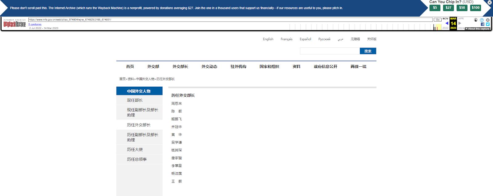 一樣再透過「Wayback Machine」檢視網頁,在資料庫中,「歷任外交部長」此區域最早的存檔頁面可追溯至 2022 年 6 月 2 日,最接近秦剛上任後的存檔頁面為2023 年 3 月 14 日,查看該頁面亦無秦剛的資料,同理可知,在「歷任外交部長」頁面本來就沒有將秦剛列入。