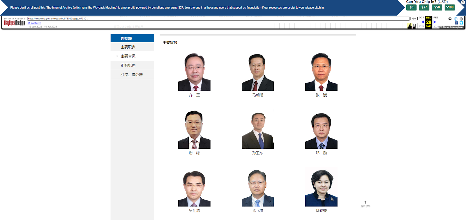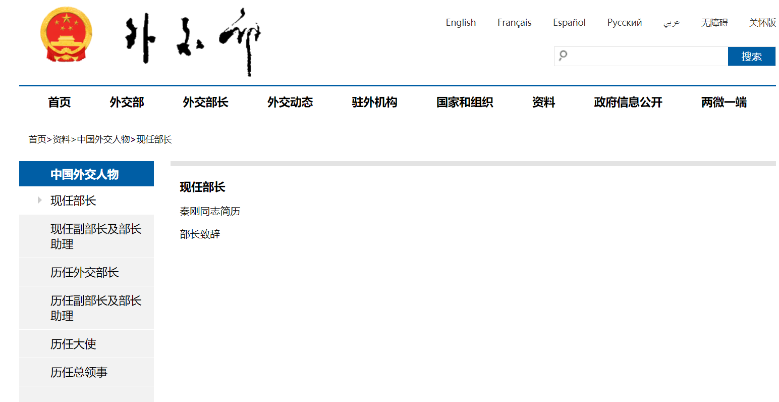 透過「Wayback Machine」檢視中國外交部網站,在資料庫中,「主要官員」此區域最早的存檔頁面可追溯至 2022 年 1 月 16 日,最接近秦剛上任前後的存檔頁面為 2022 年 12 月 28 日和2023 年 1 月 24 日;而前者無時任中國外交部長王毅的資料,後者也無現任中國外交部長秦剛的資料,由此可知,在「主要官員」頁面區塊本來就沒有將外交部長列入。