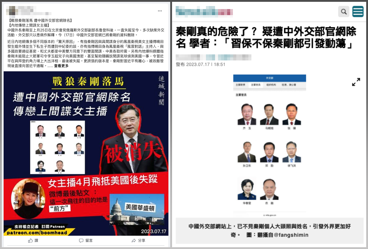 網傳「戰狼秦剛落馬,遭中國外交部官網除名」的訊息和圖片。經查證,傳言主要搭配中國外交部官網「主要官員」、「歷任外交部長」這兩個頁面的截圖畫面,宣稱秦剛被除名,但實際透過「Wayback Machine」網站檢視過去的存檔畫面,這兩個頁面本來就沒有將秦剛列入,因為秦剛為中國現任外交部長,所以其個人資料是獨立出來的頁面,目前在「部長簡歷」、「現任外交部長」區塊中均可看到秦剛的介紹,網傳訊息為錯誤說法。