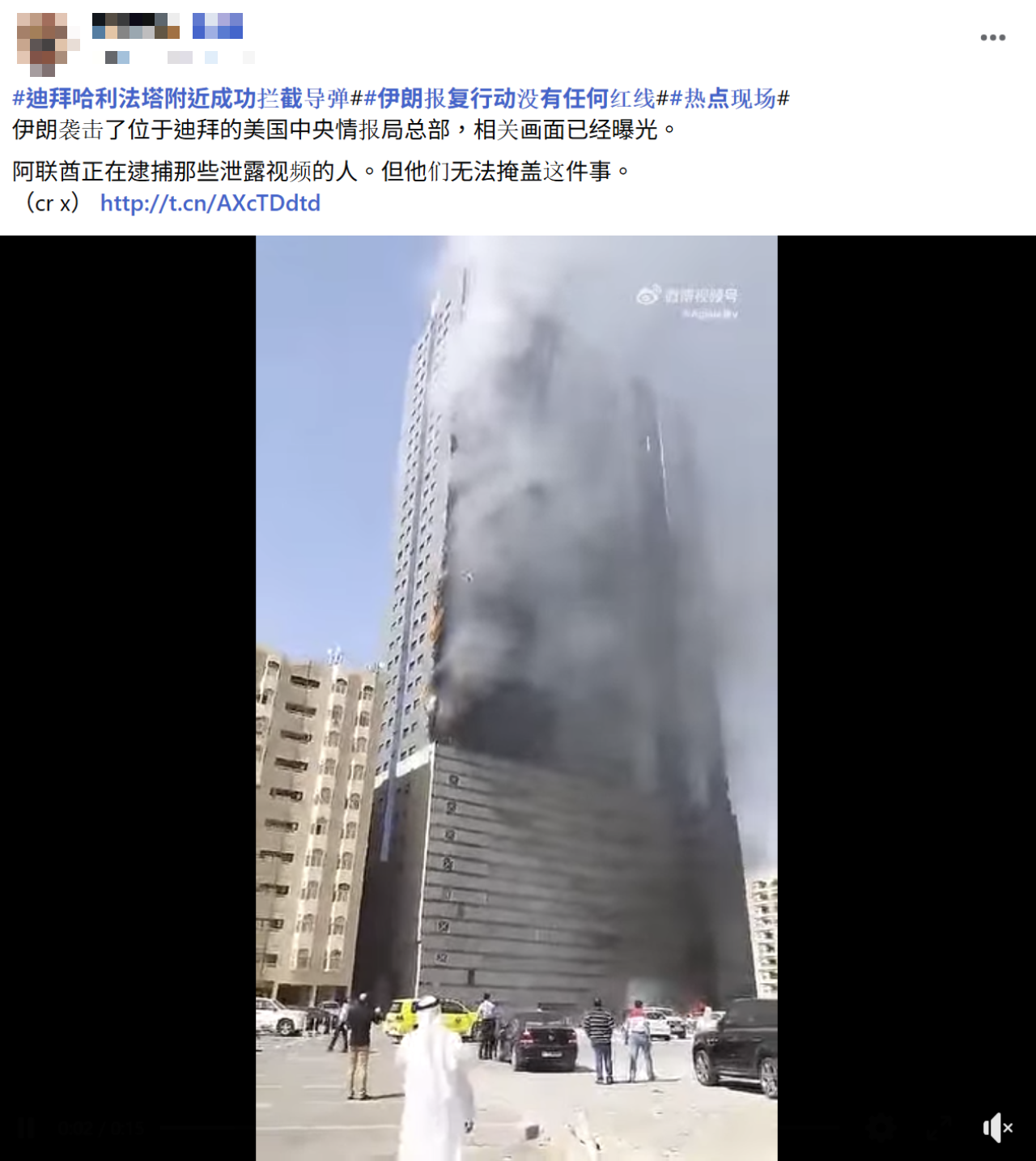 【錯誤】美國在杜拜的中情局總部遭伊朗飛彈襲擊?畫面曝光?實為2015年杜拜高樓失火畫面