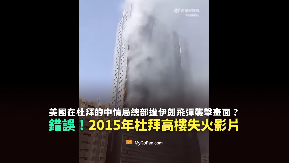 網傳「伊朗襲擊美國中情局總部」的影片及訊息,畫面顯示一棟大樓冒出熊熊火光,聲稱是伊朗發射飛彈,擊中美國在杜拜的中央情報局總部。經查證,網傳影片於 2015 年 10 月即在網路上出現,該影片拍攝地點是在阿拉伯聯合大公國沙加地區(Sharjah),當時一棟 32 層樓高的大樓起火燃燒,火勢波及 24 間公寓,所幸無人死亡,網傳片段與近期伊朗攻擊中東國家無關,網傳訊息不正確。