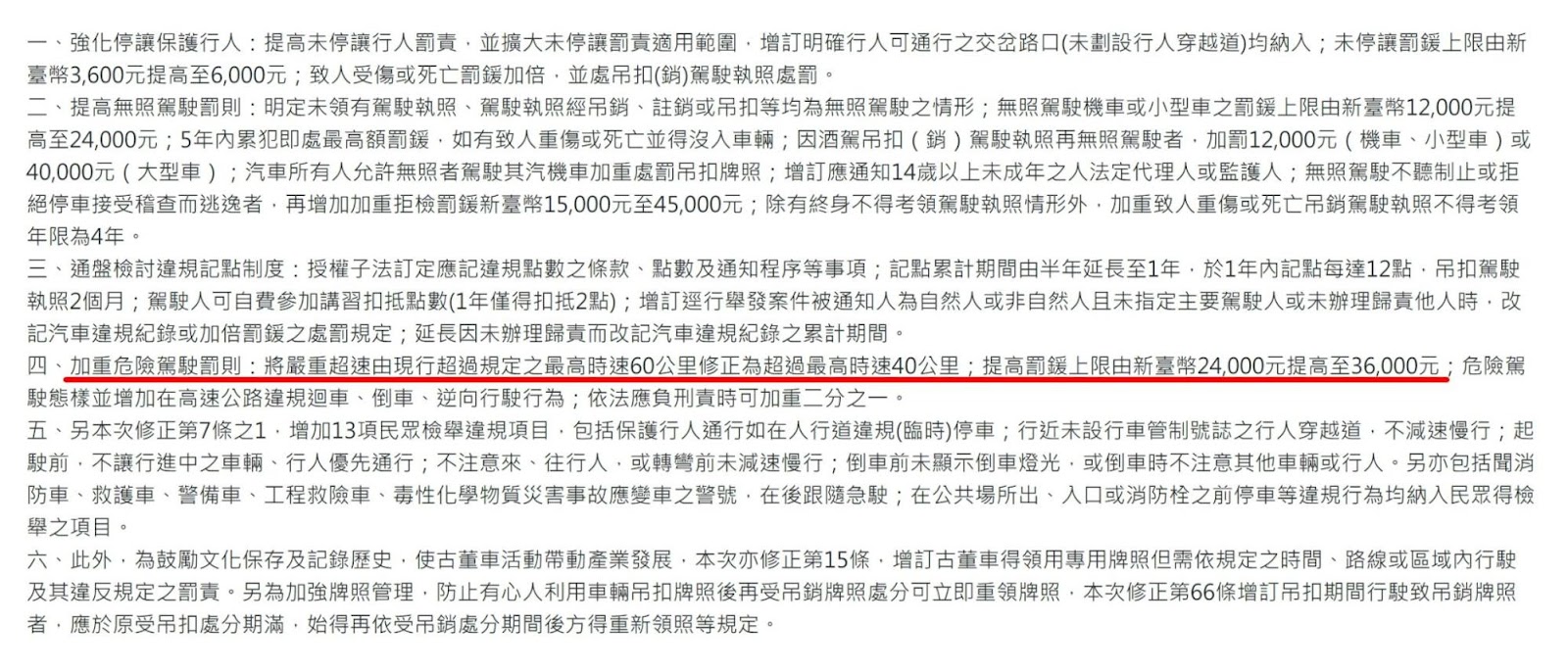 補充:條文內容提及的「超速 60 公里修正為 40 公里」,是指假如一個路段限速 50 公里,過去舊法要到 110 公里才算嚴重超速,法條修正後,90 公里即算嚴重超速。