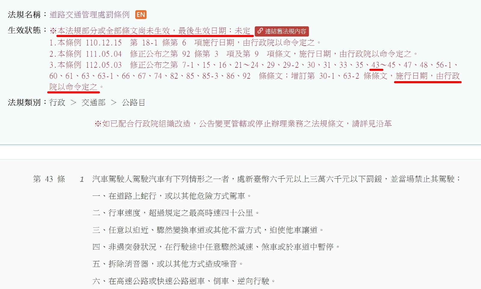 檢視法務部全國法規資料庫,可以看到《道路交通管理處罰條例》第 43 條雖然已放上新的法規內容,但「生效狀態」欄位有特別用紅字註明「最後生效日期:未定」,施行日期,由行政院以命令定之,由此可知,新修正案正式上路的日期仍不確定。