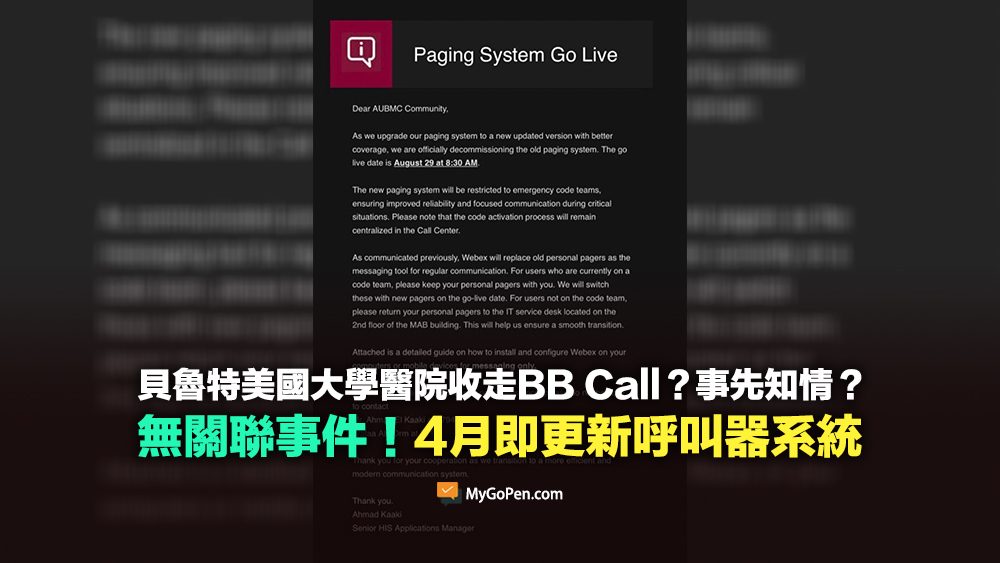 「我們的呼叫器系統設備於 2024 年 4 月進行升級,並於 8 月 29 日轉換到新系統正式上線運作。這次更新的範圍是加強緊急情況與代碼通訊,因為部分設備與系統已經過時了。」(Our paging system infrastructure was upgraded in April 2024. The Go-Live for switching to the new system took place on August 29, 2024. The scope of this upgrade was to enhance emergency and code communication, as several devices and systems had become obsolete.)並無證據顯示該次升級與 BB Call 爆炸案有關。