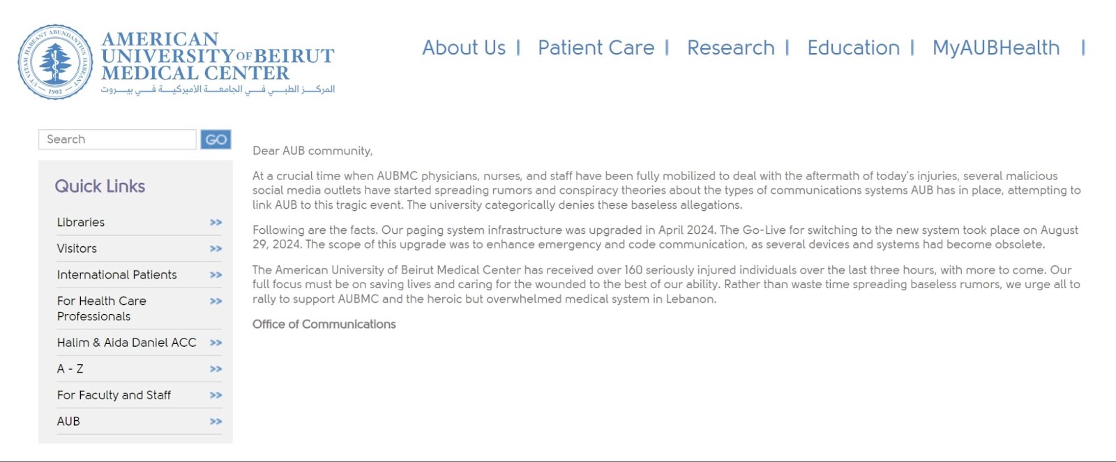 搜尋貝魯特美國大學醫學中心的官網及社群帳號,發現該醫學中心於 9 月 18 日(BB Call 爆炸案隔天)即在官網、Facebook、X、Instagram 等同步發出聲明,表示: