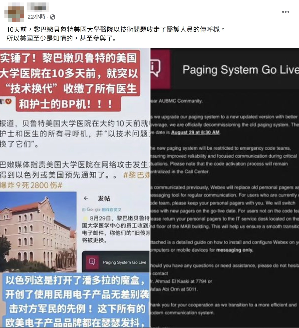【錯誤】貝魯特美國大學醫院收走BB Call?事先知情?無關聯事件!缺乏事實依據