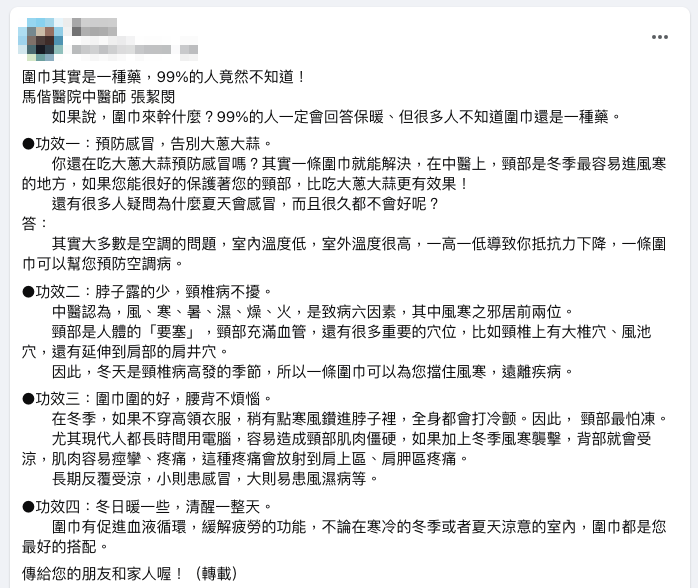 網傳「圍巾其實是一種藥,99%的人竟然不知道!」貼文,提到圍巾可以預防感冒、空調病,還能遠離頸椎病、腰背疼痛、頭腦清醒等。但專家表示,圍巾具有保暖的功效,從溫暖的室內出去到寒冷的室外時,圍住頸脖透風的部位有助於保護全身血管、血壓,也能保暖與咳嗽有關的天突穴、與喉嚨腫痛有關的頏顙穴、與頭痛有關的風池穴等,但上呼吸道疾病還包括細菌、病毒所引起的傳染病,圍巾不可能防止病原傳播、避免傳染途徑,傳言說法以偏概全、傳言說法易誤導。