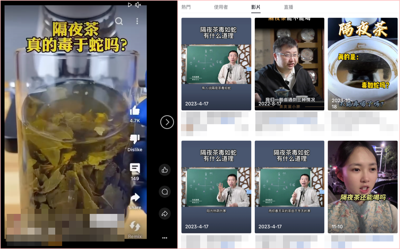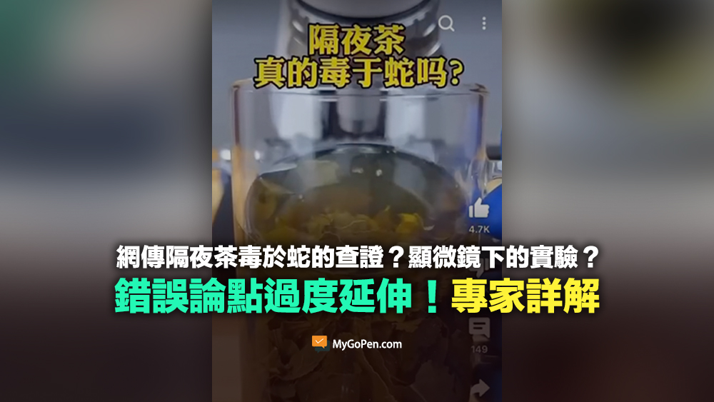 網傳「隔夜茶真的不能喝嗎?」實驗影片,將泡著茶葉的隔夜茶水拿到顯微鏡底下觀察,並無特殊發現而得出隔夜茶可以喝的結論。專家表示,傳言「隔夜茶毒於蛇」的說法應與亞硝酸鹽無關,其實是茶水中的「單寧酸」易使消化功能較弱的人發生胃腸不適,有此症狀的人應避免「濃茶」,但泡出濃茶不只是沖泡時間、也與茶葉量、熱水溫度等因素有關,且泡茶時間長短與隔夜與否無關,傳言說法將胃腸不適過度延伸,連結到孳生細菌、亞硝酸鹽,傳言說法錯誤。傳言說「隔夜茶裡有很多抗氧化物、不容易變質」,則是以錯誤的論點來解釋,傳言說法錯誤。