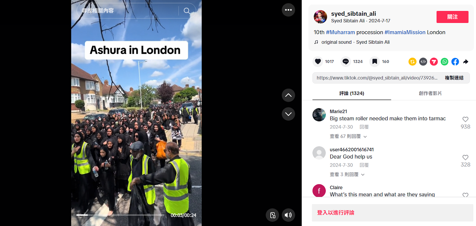 下半部經截圖反搜,查找到 TikTok 帳號「syed_sibtain_ali」在 2024 年 7 月 17 日有發布相同的影片,原始影片畫面中有「阿舒拉節在倫敦」(Ashura in London)的文字,阿舒拉節是伊斯蘭曆每年穆哈蘭姆月的第十天,由此可知影片是當地穆斯林舉辦的阿舒拉節活動。