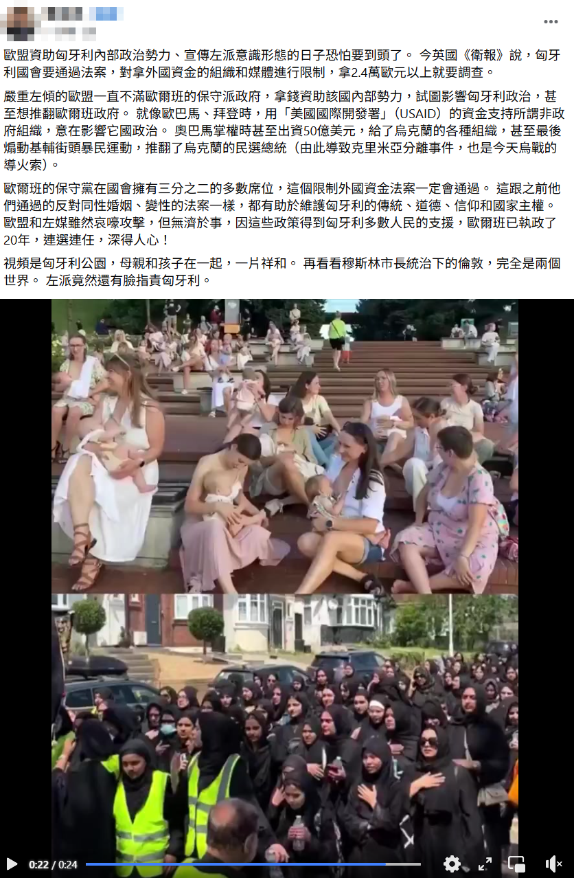網傳影片與訊息稱「今英國《衛報》說,匈牙利國會要通過法案」、「對拿外國資金的組織和媒體進行限制,拿2.4萬歐元以上就要調查」。經查證,《衛報》近期的確有相關報導,但傳言所提的法案,實為匈牙利國會於 2017 年通過、並已於 2020 年廢除的舊法,並非目前正在審議的新法內容。事實上,匈牙利總理奧班(Viktor Orbán)執政長達 15 年,執政期間通過許多打壓批評政府的公民團體、獨立媒體之法案,並宣稱反對他的團體都是被外國利用來推翻政府的勢力。近期執政黨再度提出法案,擬將批評政府的團體列入黑名單,禁止其獲得捐款,引發大規模抗議。傳言影片挪用 2024 年波蘭舉辦哺乳快閃活動和倫敦舉辦的阿舒拉節活動,與網傳敘述無關。