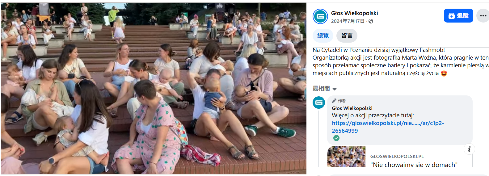網傳影片的上半部經截圖反搜後,查找到波蘭媒體《Głos Wielkopolski》於 2024 年 7 月 17 日在 Facebook 上有發布相同的影片,貼文中指出,這是攝影師 Marta Woźna 在波茲南城堡舉辦的一場快閃活動,希望用這樣的方式打破社會障礙,表現出在公共場所哺乳是生活中自然的一部分。