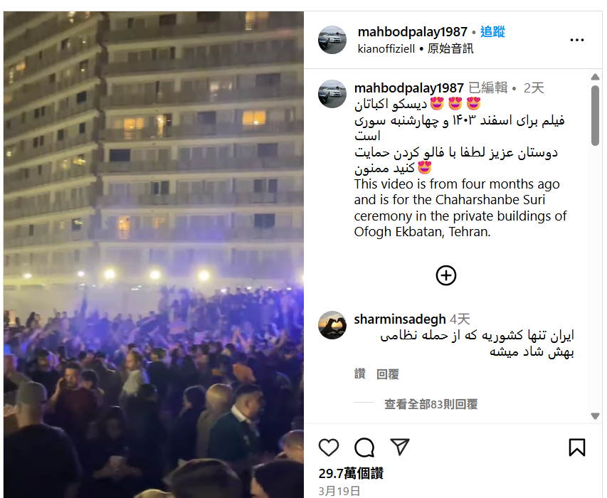 (二)以波斯文為關鍵字進一步搜尋,查找到影片的原始來源應出自 Instagram 帳號「mahbodpalay1987」,其於 2025 年 3 月 19 日發布此影片,貼文中指出,這是 4 個月前在德黑蘭的一處公寓社區拍攝,當時是在慶祝伊朗的跳火節(Chaharshanbe Suri)。