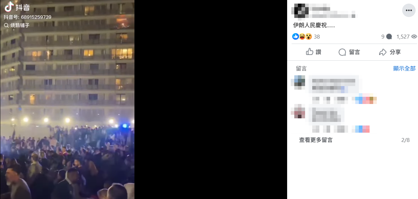 網傳「戰爭第三天 伊朗人跳舞」、「伊朗人民慶祝」的訊息和影片。經查證,網傳的 3 則影片均為舊畫面,和近期以色列、伊朗的衝突無關,有伊朗人在塞車時跳舞、慶祝跳火節的畫面,以及 2024 年伊朗裔和猶太裔加拿大人一起在多倫多街頭慶祝黎巴嫩真主黨領袖納斯拉勒被以色列擊斃。傳言敘述為錯誤訊息。