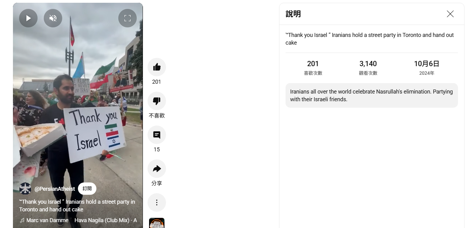 (一)將網傳影片截圖反搜後,查找到此影片至少在 2024 年 10 月 6 日就已經出現在網路上,根據 YouTube 影片資訊欄中指出,當時伊朗人在多倫多舉行街頭派對、分送手做蛋糕,慶祝黎巴嫩真主黨領袖納斯拉勒(Hassan Nasrallah)被消滅,和以色列人一起歡聚。