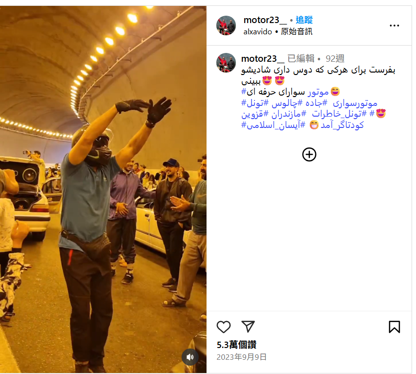 (二)再進一步查看此帳號的其他貼文,發現他在同一天還有發布另一則影片,和網傳影片相同,不過,原始貼文中沒有提到這是什麼情況;在搜尋過程中發現,有另一個帳號「iran_beautiful_ir」於 2023 年 9 月 12 日轉載了此影片,並表示,根據當地媒體報導,當時因為交通擁塞,路段塞車,所以伊朗人就在車陣中跳起舞來。