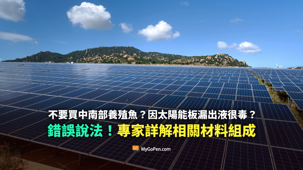 網傳「颱風過後、請不要買中南部的養殖魚」、「因為太陽能板破了漏出的粉液、非常毒」的訊息。MyGoPen 實際詢問專家,前弘光科技大學環境與安全衛生工程系副教授段柔勇表示,太陽能板基本上整個都是固體,內部也沒有液體存在,不可能因天災損壞掉入水中就溶出有毒液體;能源署過去也曾經闢謠,太陽能板的主要材料為無毒的矽,不會溶解或滲出液體、不會造成土地或水源汙染。傳言為錯誤訊息。