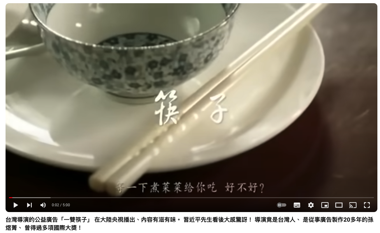 《筷子》 影片當初因機緣讓「習近平」看了大為感動,忙問這導演是誰? 有才!! 當屬下回話說台灣拍的, 聽說他沈默很久~ 政治讓我們以為自己是, 國民黨 民進黨 民衆黨 共產黨…… 但一雙《筷子》, 卻讓我們明白 自己是 傳承【中華文化】的炎黃子孫!! 台灣導演的公益廣告「一雙筷子」 在大陸央視播出、內容有滋有味。 習近平先生看後大感驚訝! 導演竟是台灣人、 是從事廣告製作20多年的孫煜菁、 曾得過多項國際大獎! https://youtu.be/5Hpsu5LcRWs&&339