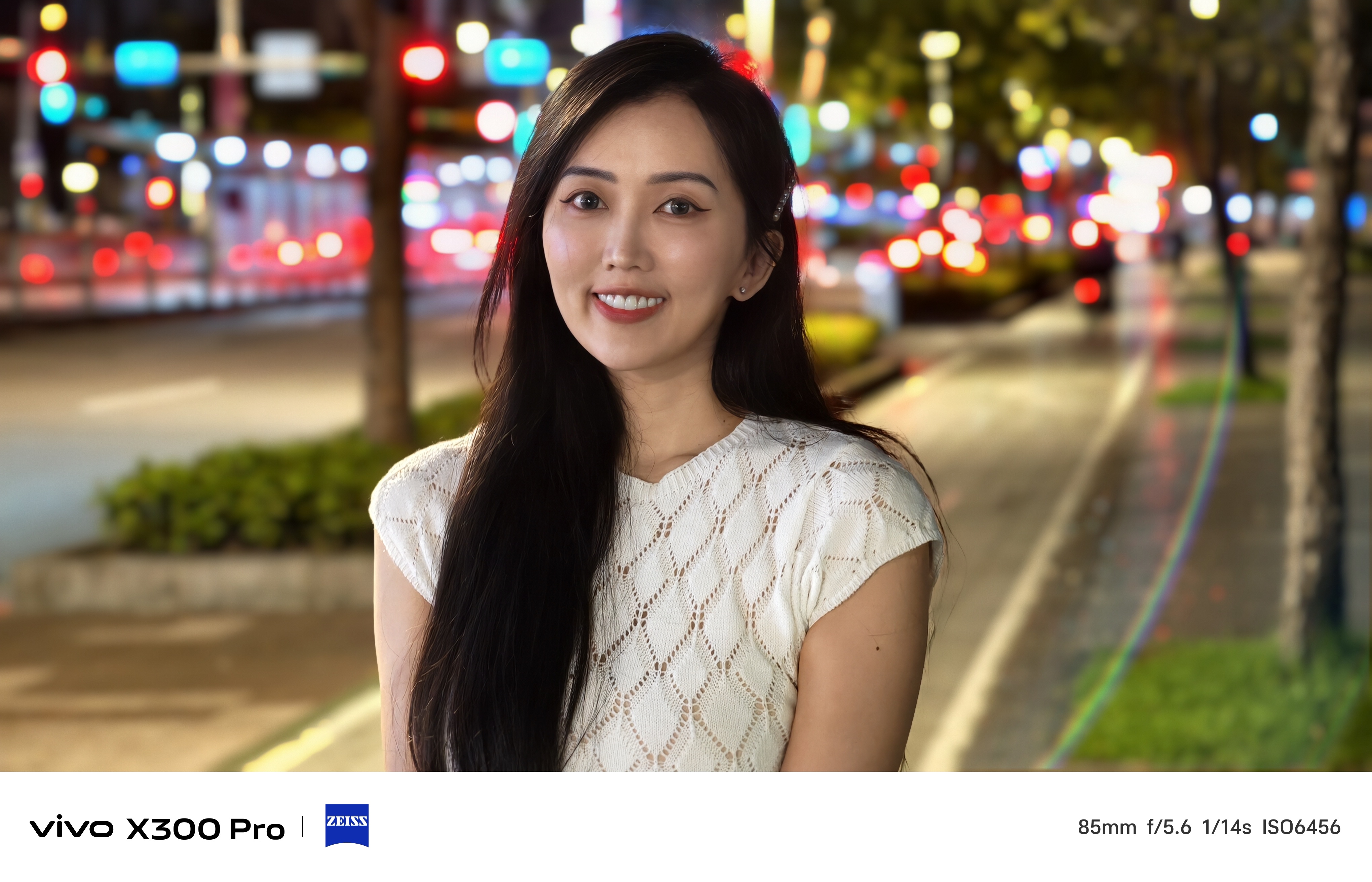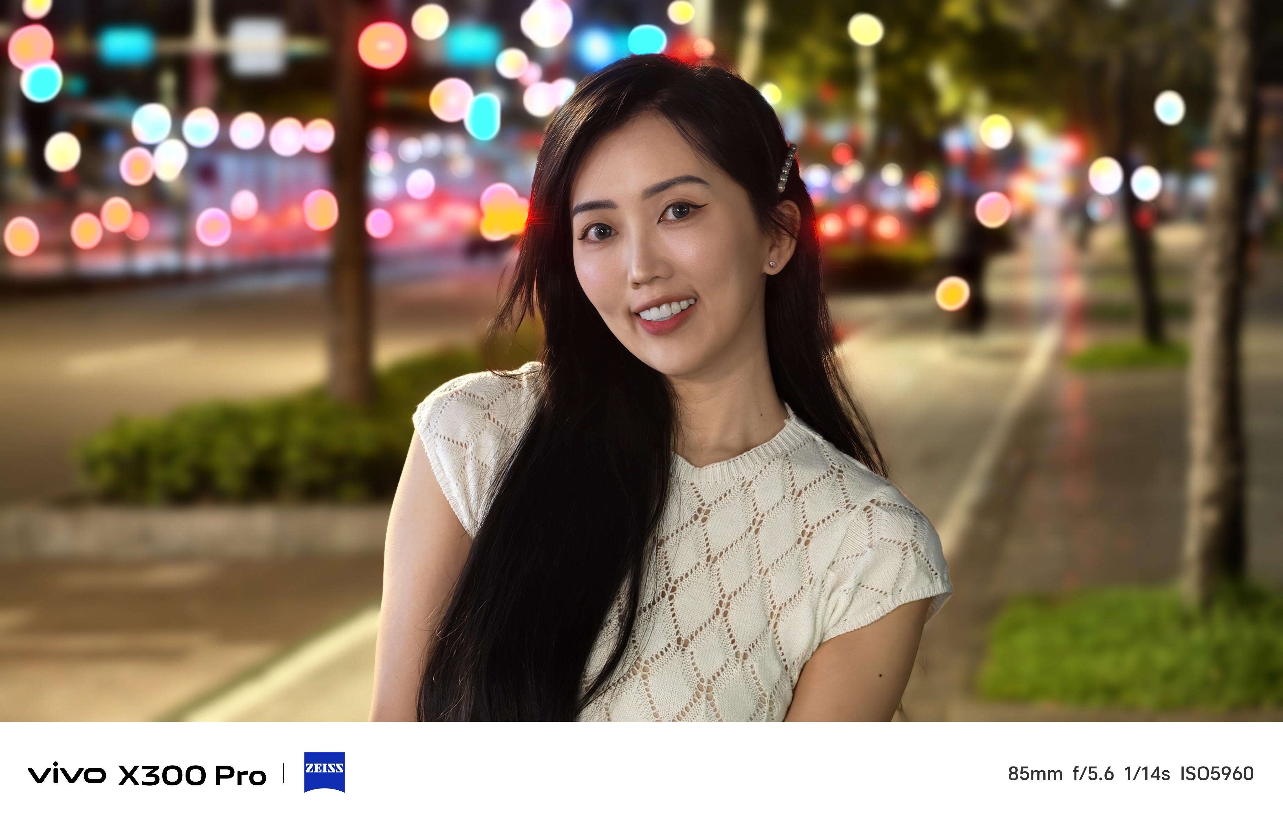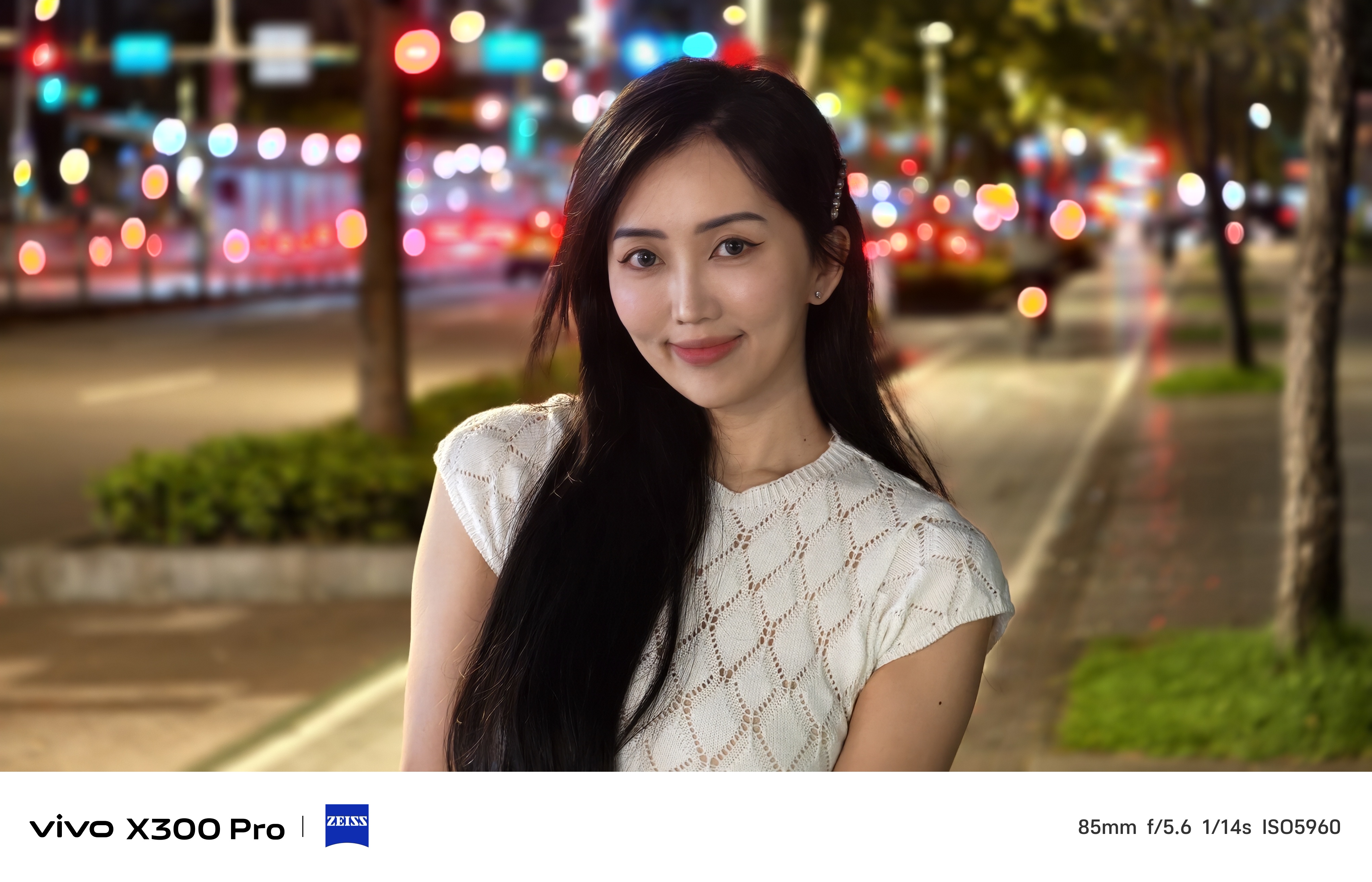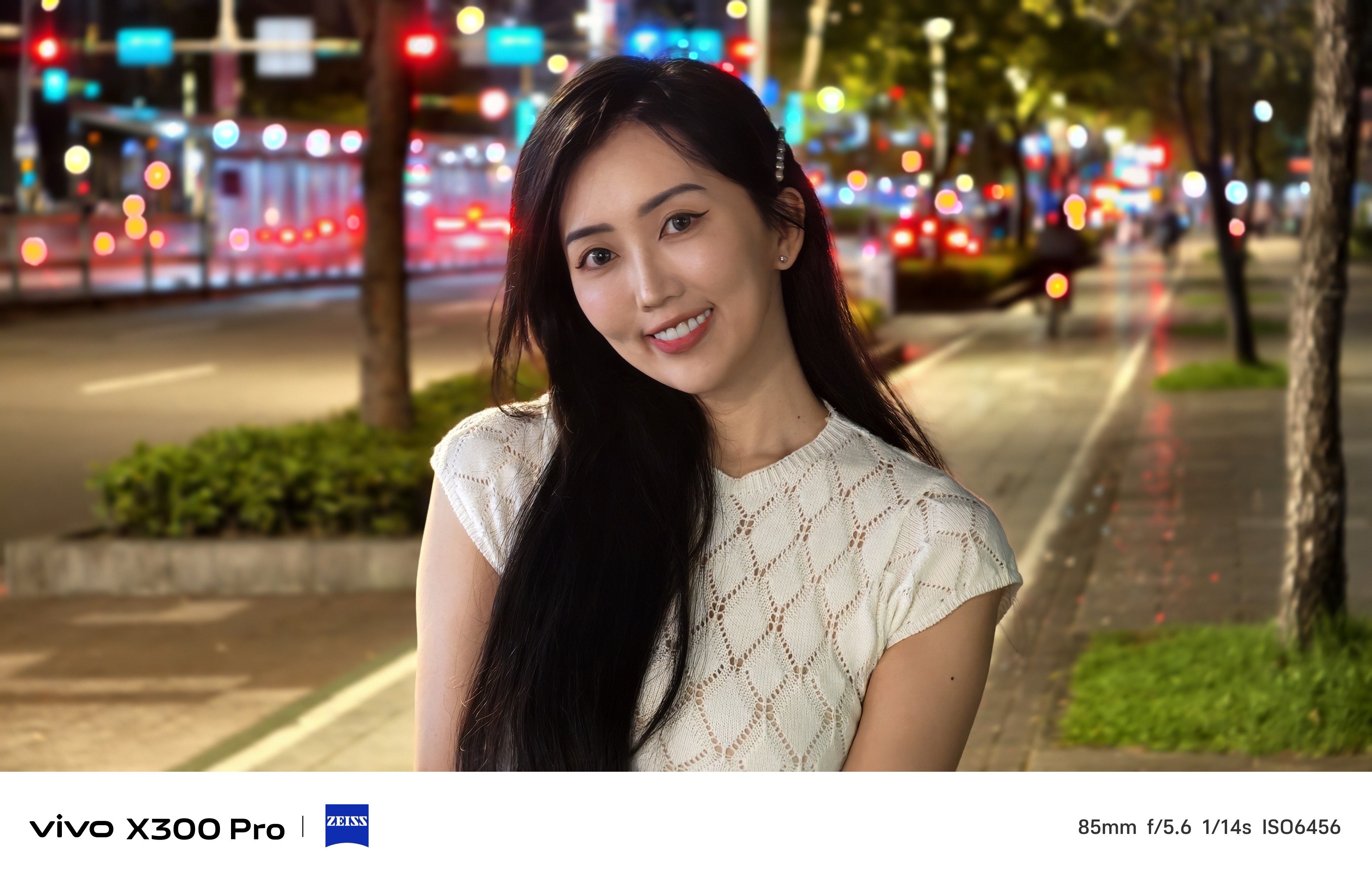由於長焦鏡頭大幅升級,vivo X300 Pro 這次在夜間人像的攝影品質也有明顯提升,從以下的實拍樣張可以看見,即便身處在夜晚環境,而且還是周圍帶有複雜光源的馬路旁,X300 Pro 透過長焦鏡頭搭配「蔡司人像風格濾鏡」依舊可以把麻豆的肌膚拍得相當明亮,就連人物邊緣與背景畫面的運算也十分清晰。此外,X300 系列的人像錄影也新增 4K 60fps 錄影選項,實用性再升級。
