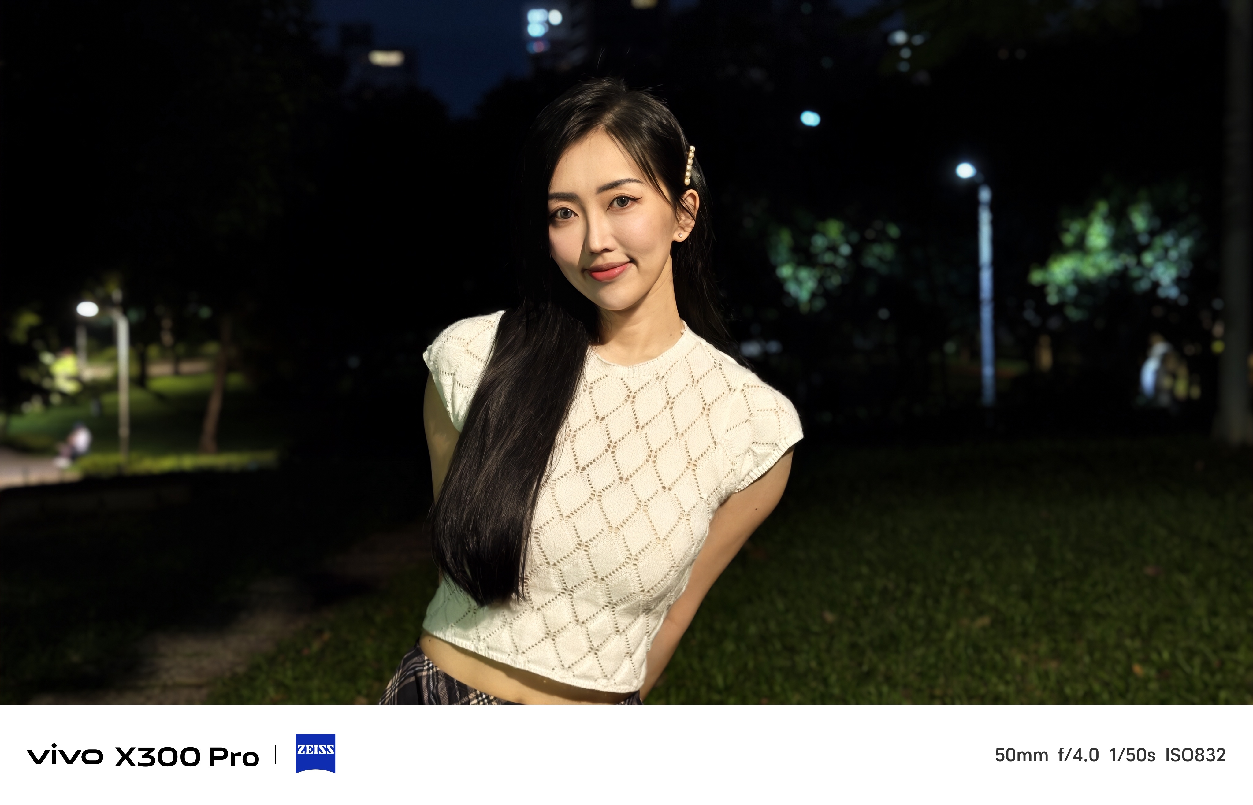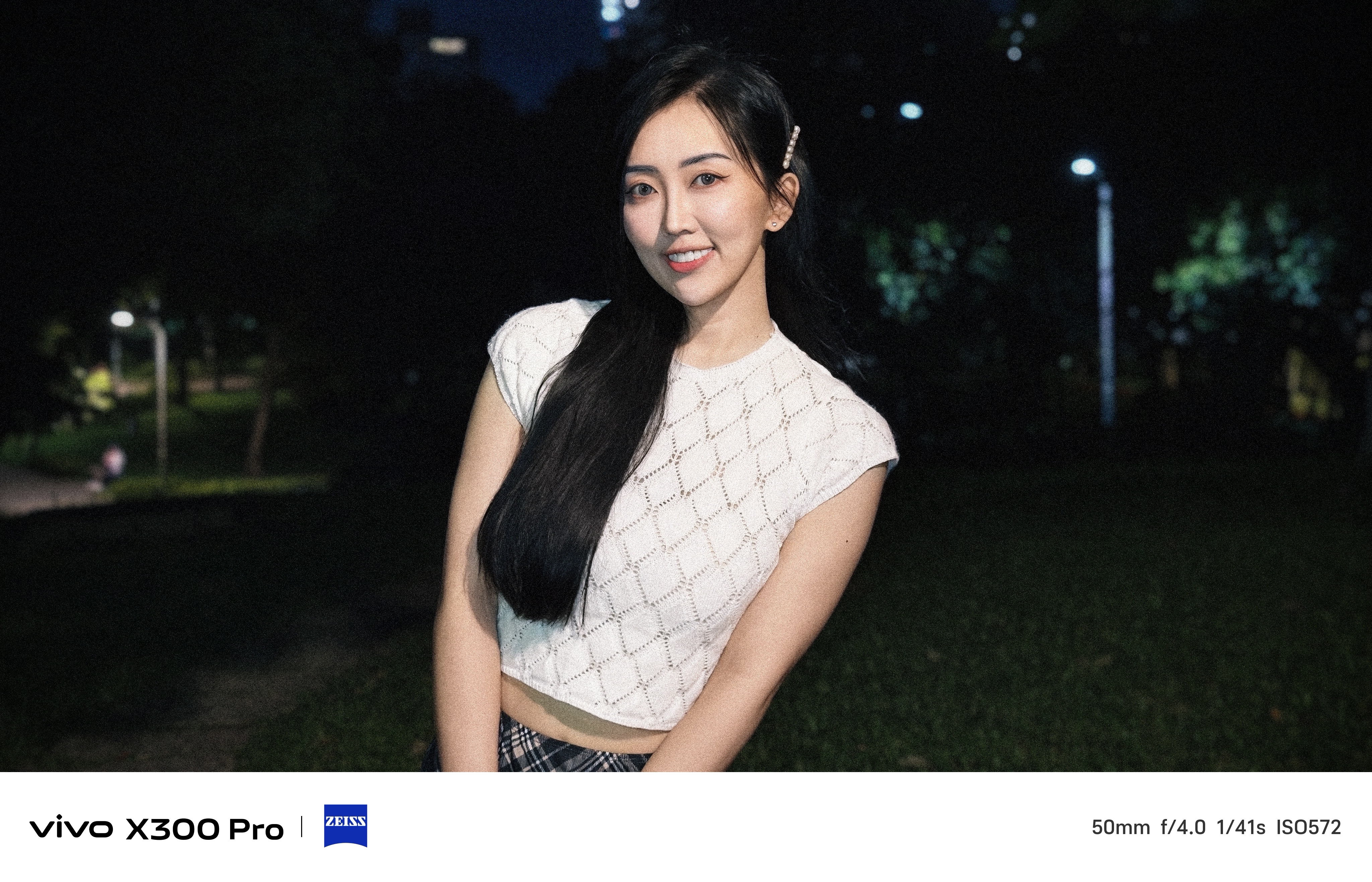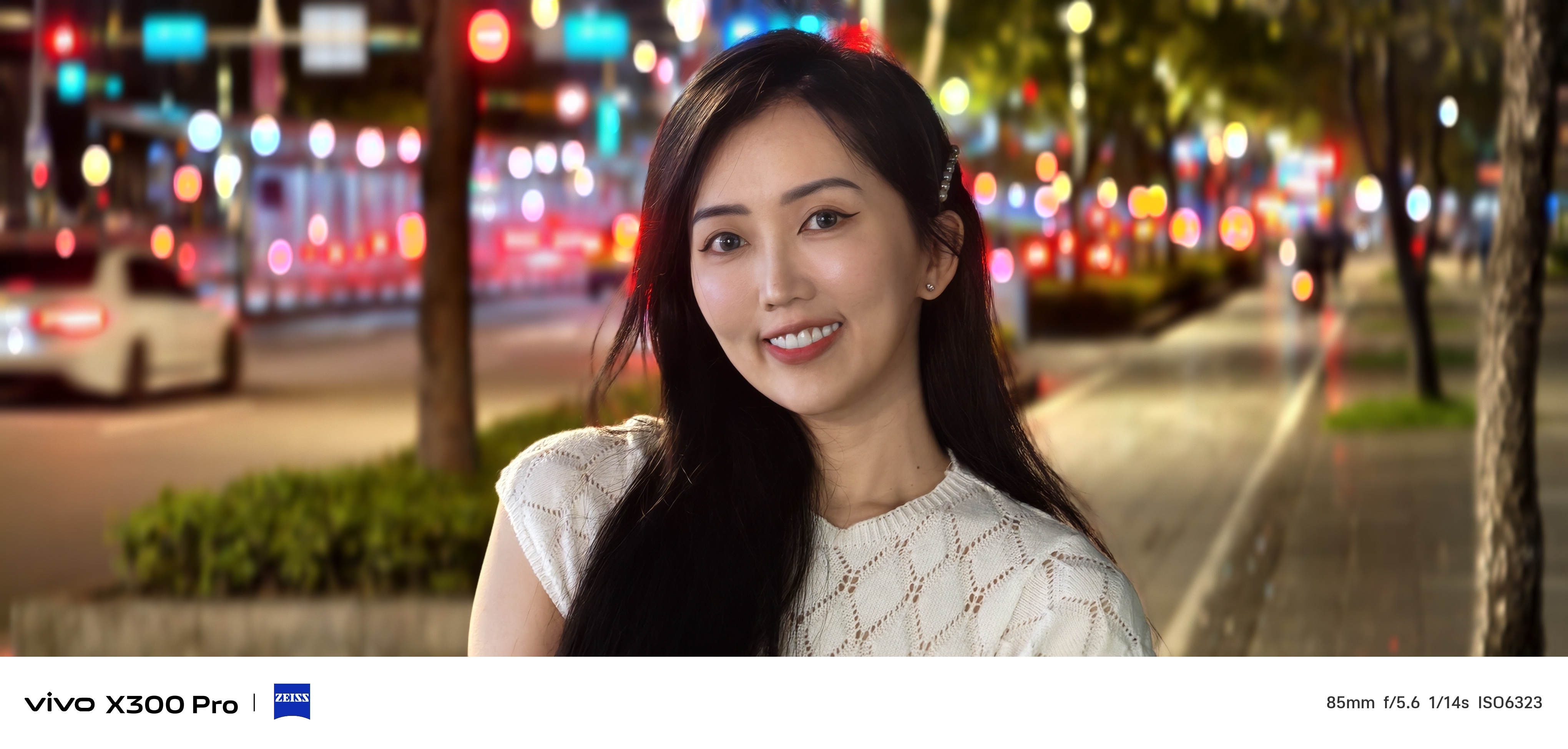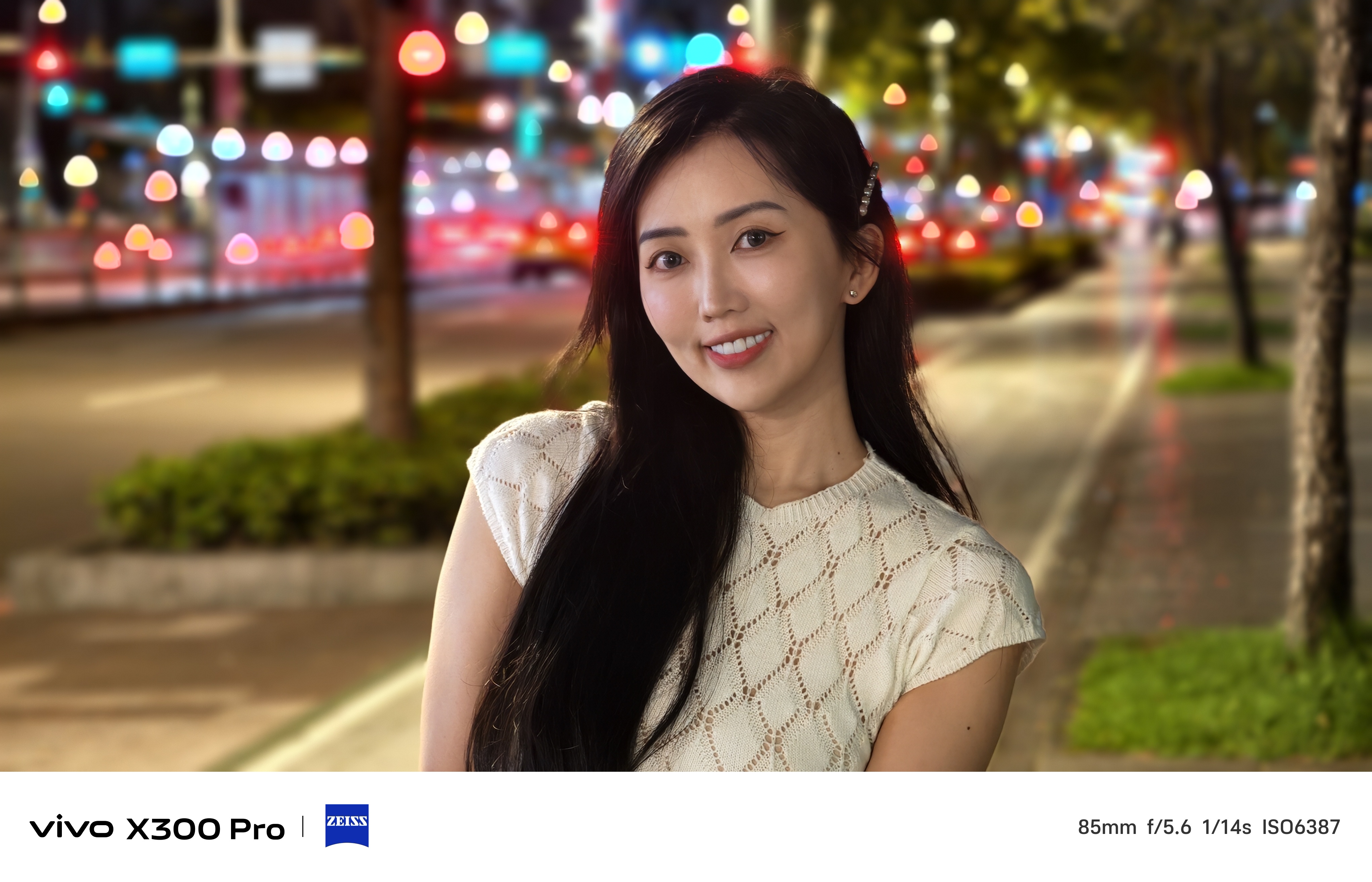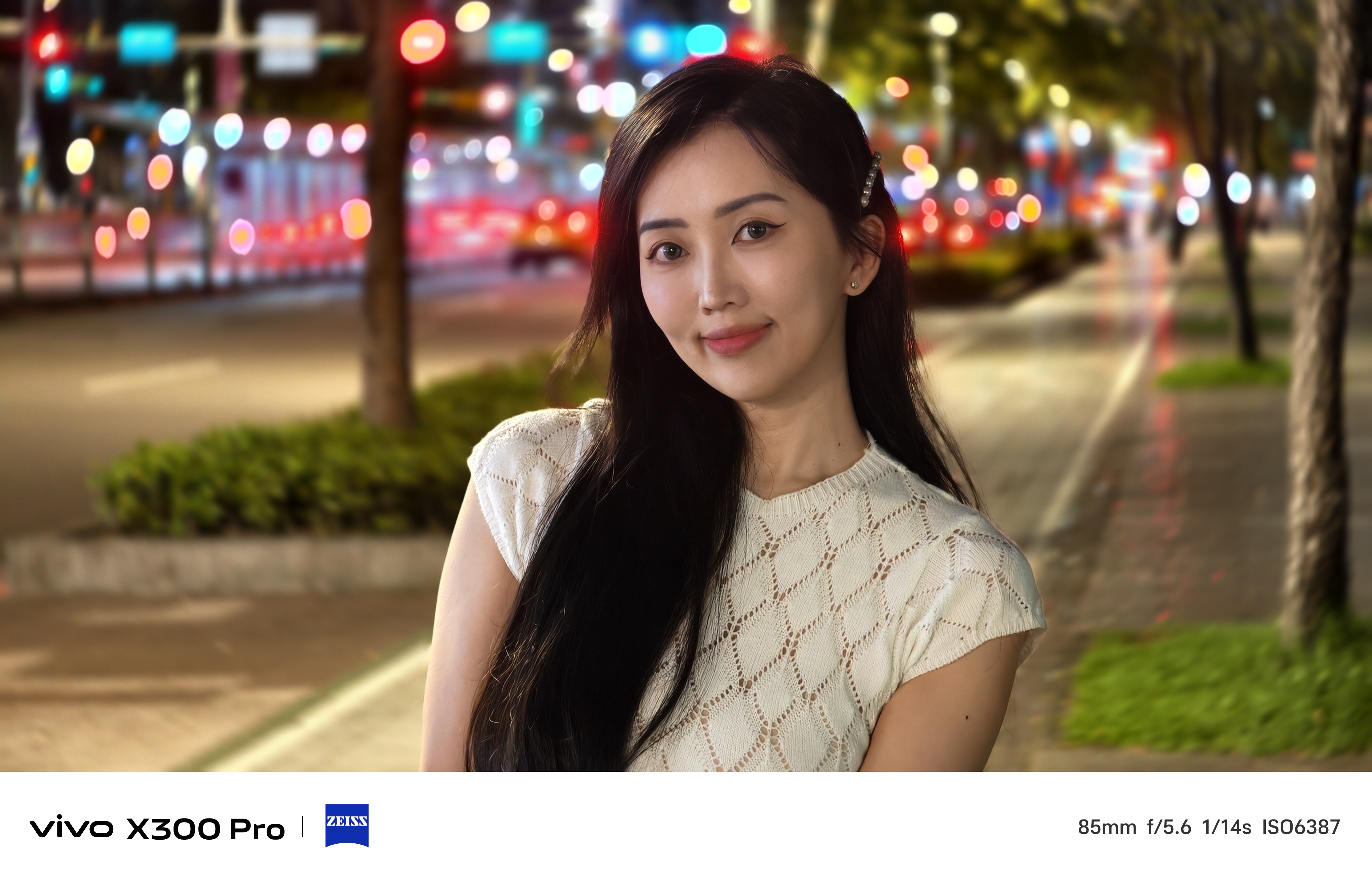 由於長焦鏡頭大幅升級,vivo X300 Pro 這次在夜間人像的攝影品質也有明顯提升,從以下的實拍樣張可以看見,即便身處在夜晚環境,而且還是周圍帶有複雜光源的馬路旁,X300 Pro 透過長焦鏡頭搭配「蔡司人像風格濾鏡」依舊可以把麻豆的肌膚拍得相當明亮,就連人物邊緣與背景畫面的運算也十分清晰。此外,X300 系列的人像錄影也新增 4K 60fps 錄影選項,實用性再升級。