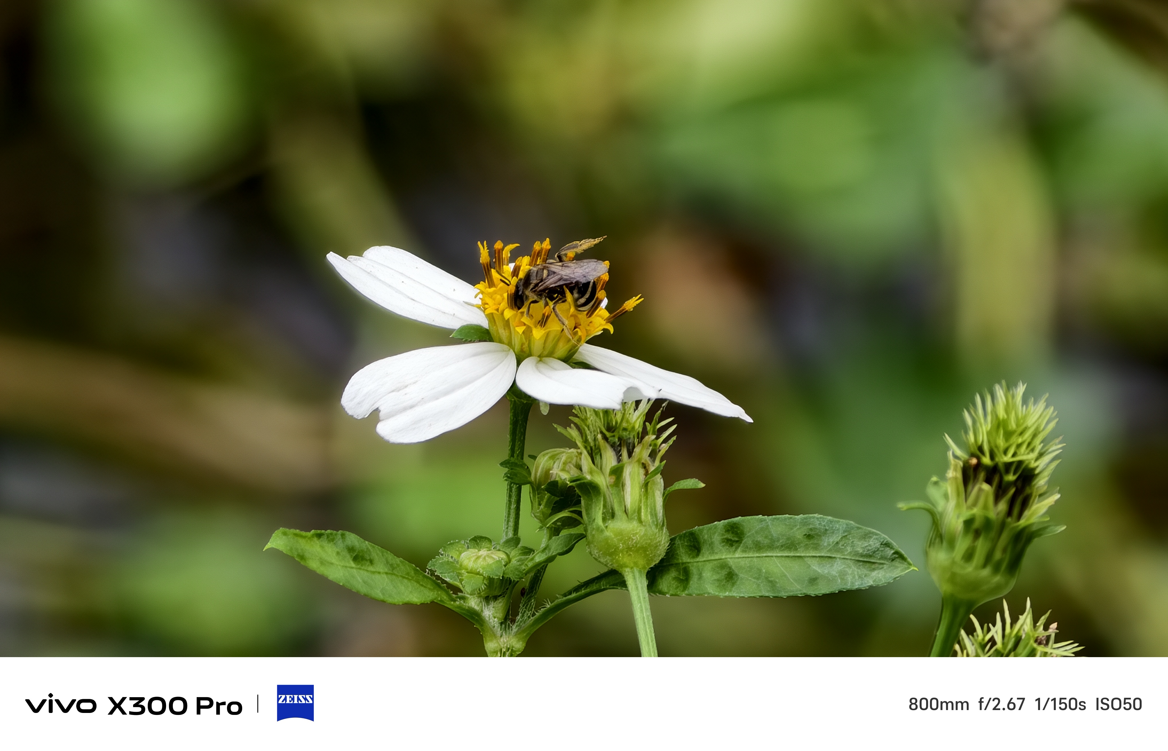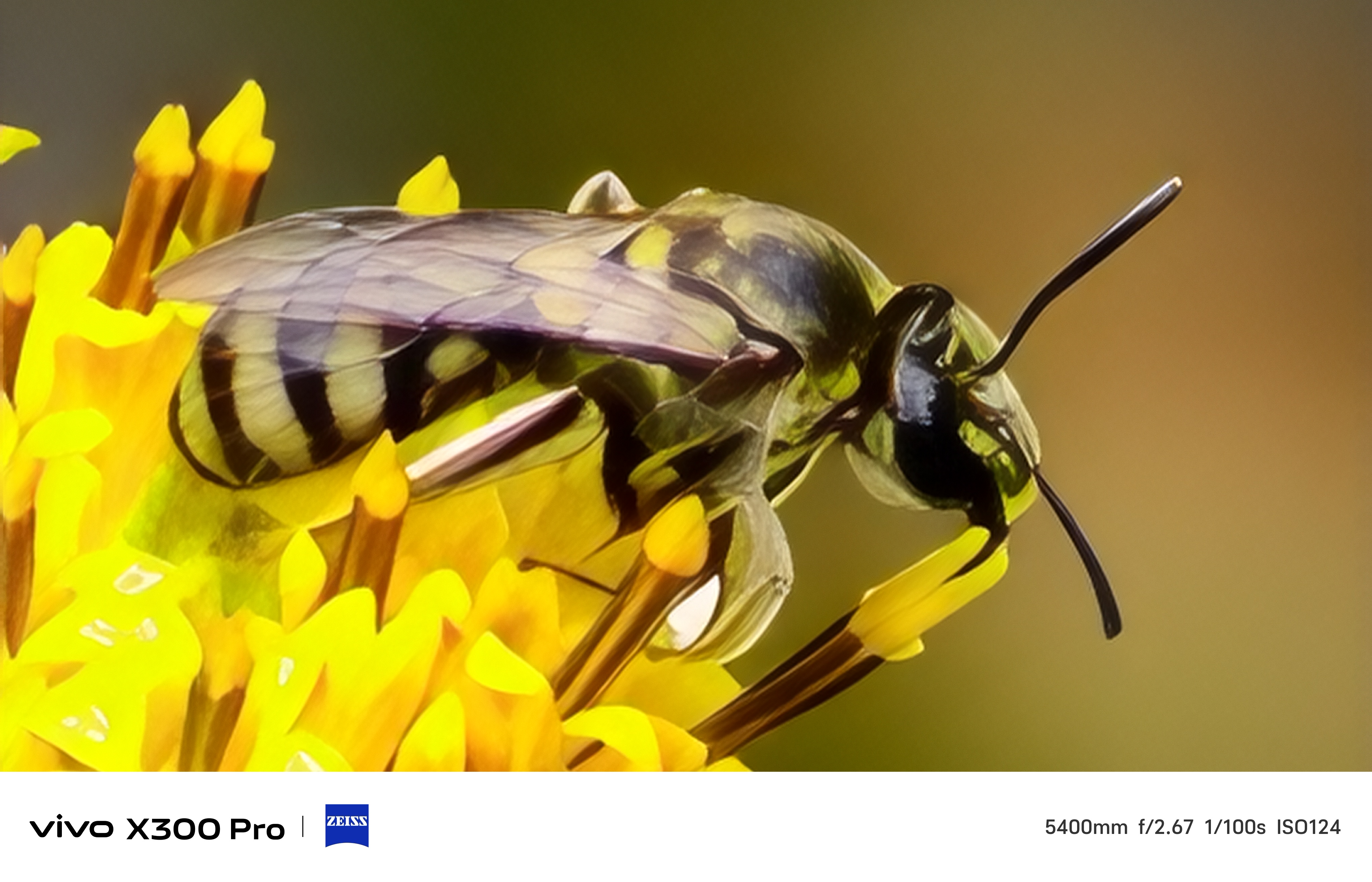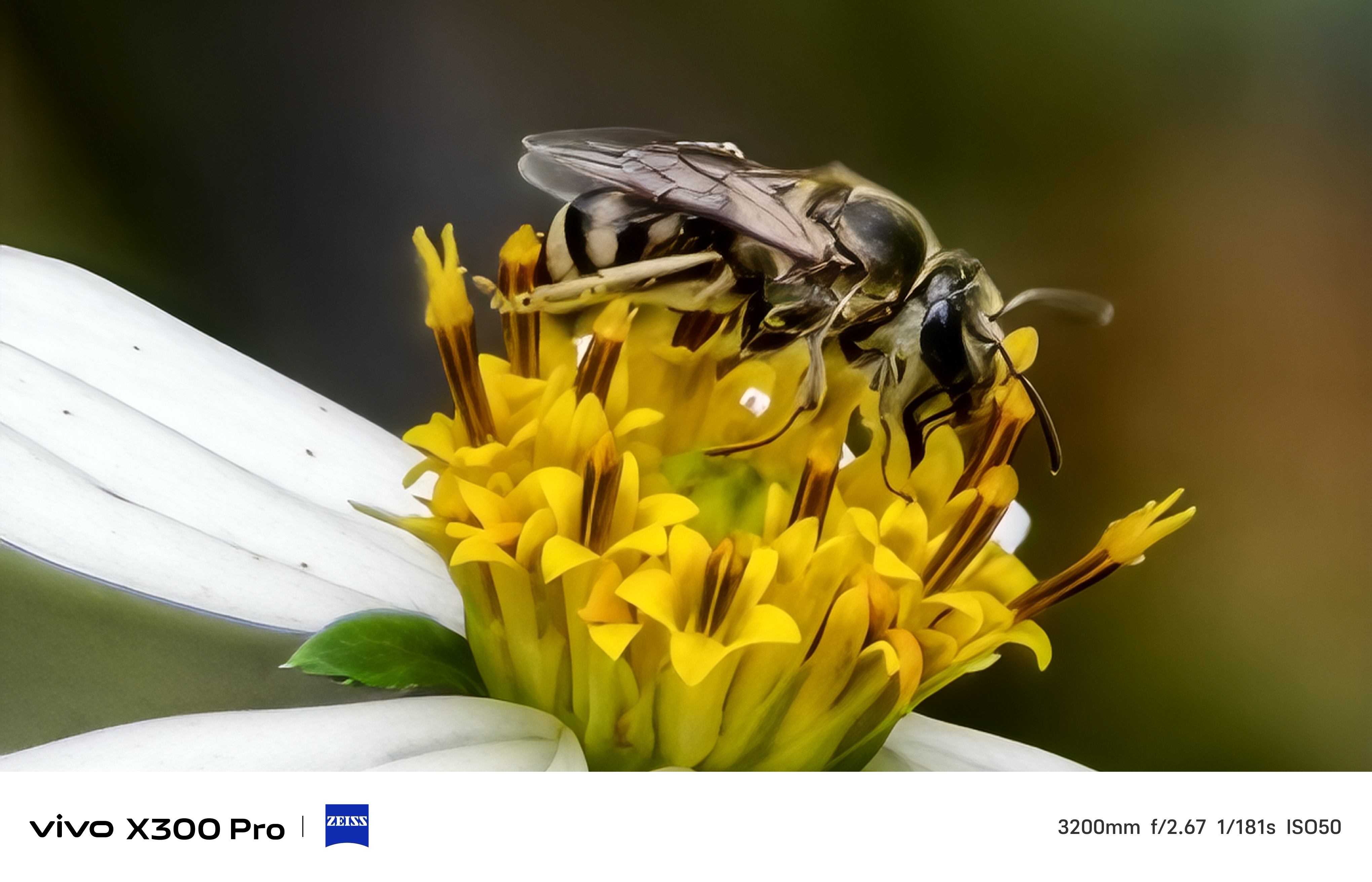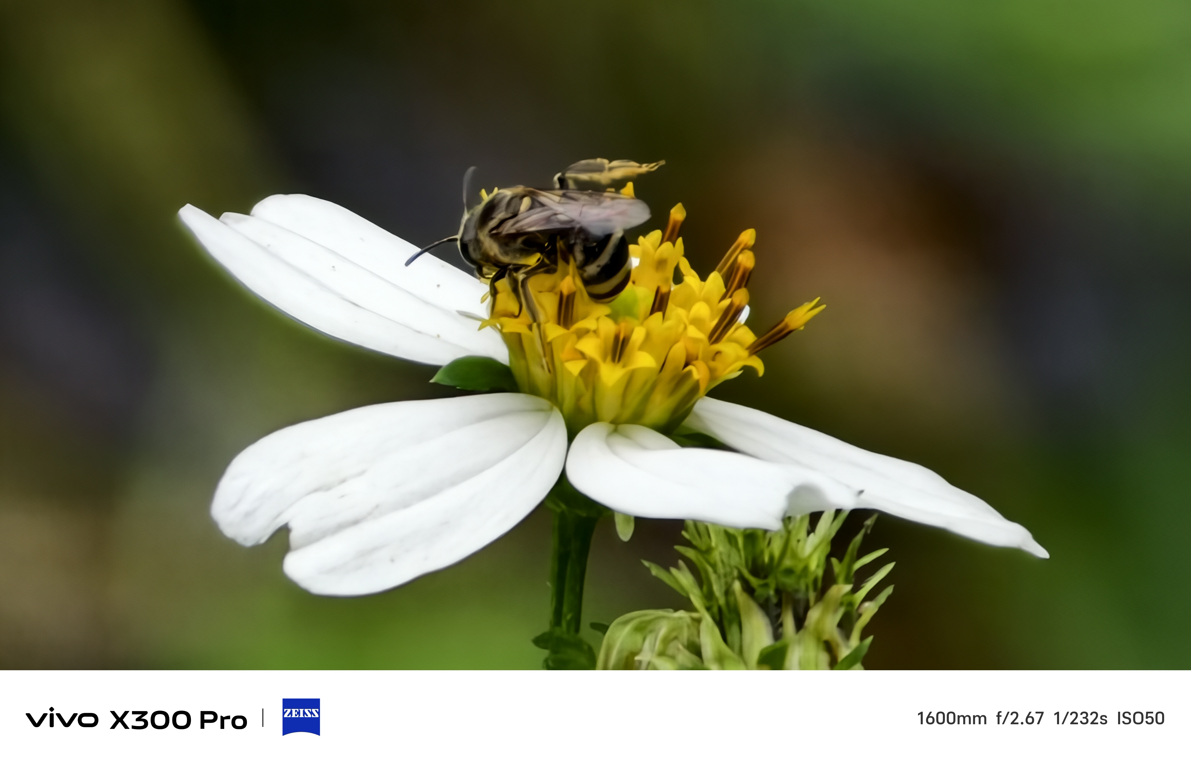 除了舞台上的人像拍攝,vivo X300 Pro 搭配長焦增距鏡捕捉日夜景更是讓人驚艷,尤其是下圖拍攝的採蜜照,即便是與我有著相當距離的花朵,在基本搭配增距鏡啟用 200mm 拍攝,就已經能夠拍出明確的攝影主體與行為,更別說在持續放大倍率之後,花朵上的蜜蜂竟然是如此的清晰可見,這確實嚇了我一跳,也讓我再度著迷於長焦攝影的樂趣。