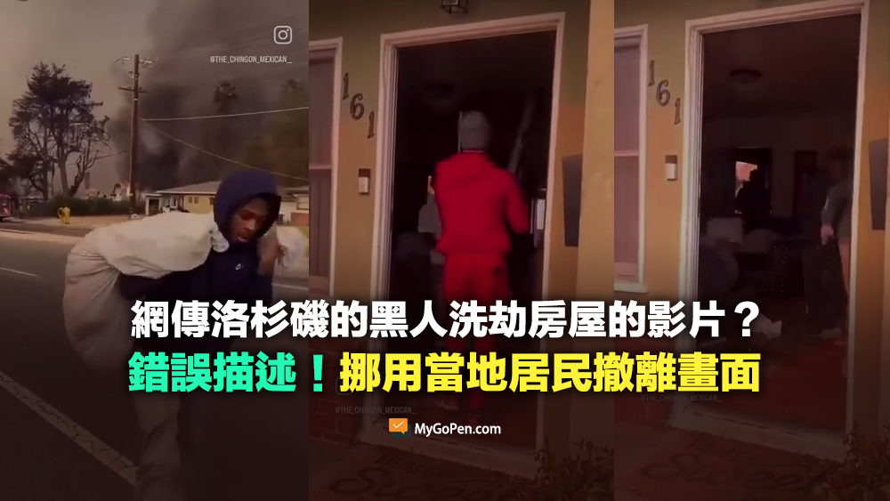 網傳「洛杉磯多個地區遭遇火災民眾紛紛避難,很多房子沒有人! 這時候洛杉磯的黑哥哥們出來了」的訊息和影片。經查證,傳言影片其實是當地一棟房屋的屋主 Teandra 和她的小孩及朋友在整理家當,準備要撤離到安全區域,傳言說法完全錯誤,並非事實;不過,洛杉磯的確有發生趁火打劫的事件,有人甚至假扮成消防員入室行竊,目前共有 29 人因竊盜、搶劫被捕。