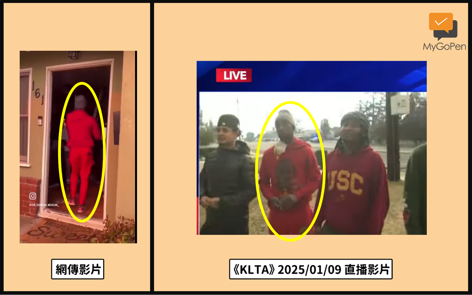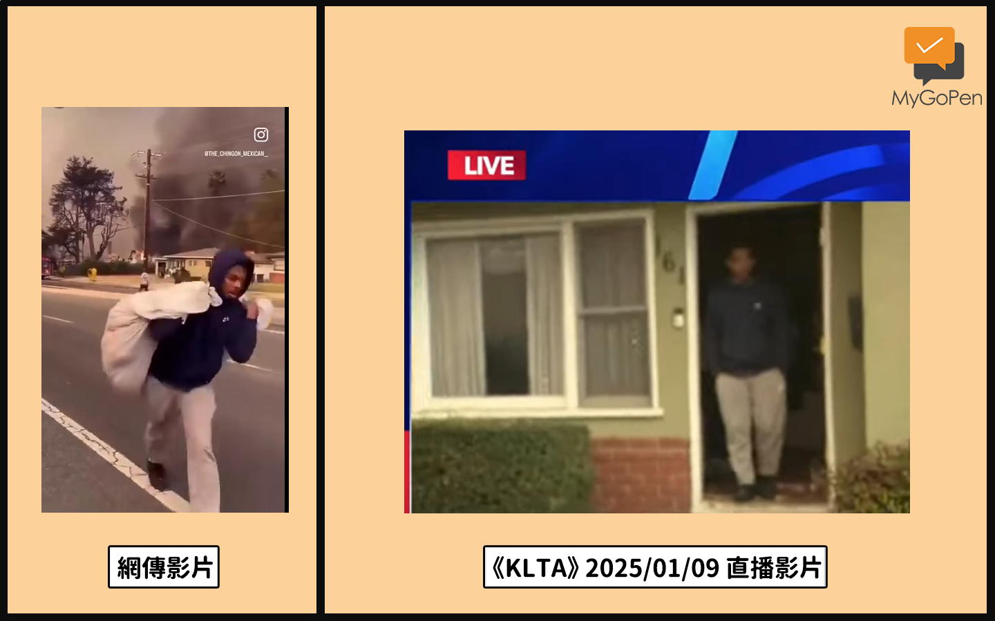 (二)各大社群平台上有許多以不同語言描述、但說法相同的貼文,其中 X 上一則 1 月 10 日發布的貼文中有社群備註指出,影片中的人不是搶劫犯,這是洛杉磯當地媒體《KLTA》採訪屋主的新聞片段,屋主表示她的孩子和朋友正在幫助她搬家。