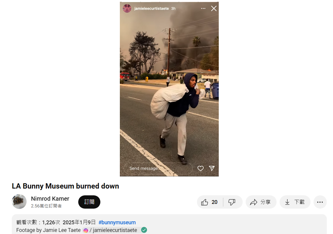 檢視影片內容,全長 55 秒,均為洛杉磯攝影師Jamie Lee Taete 在 Instagram 發布的限時動態,共有 5 則,是洛杉磯野火現場的畫面,原始影片中並沒有宣稱這是有人趁火打劫的文字描述。