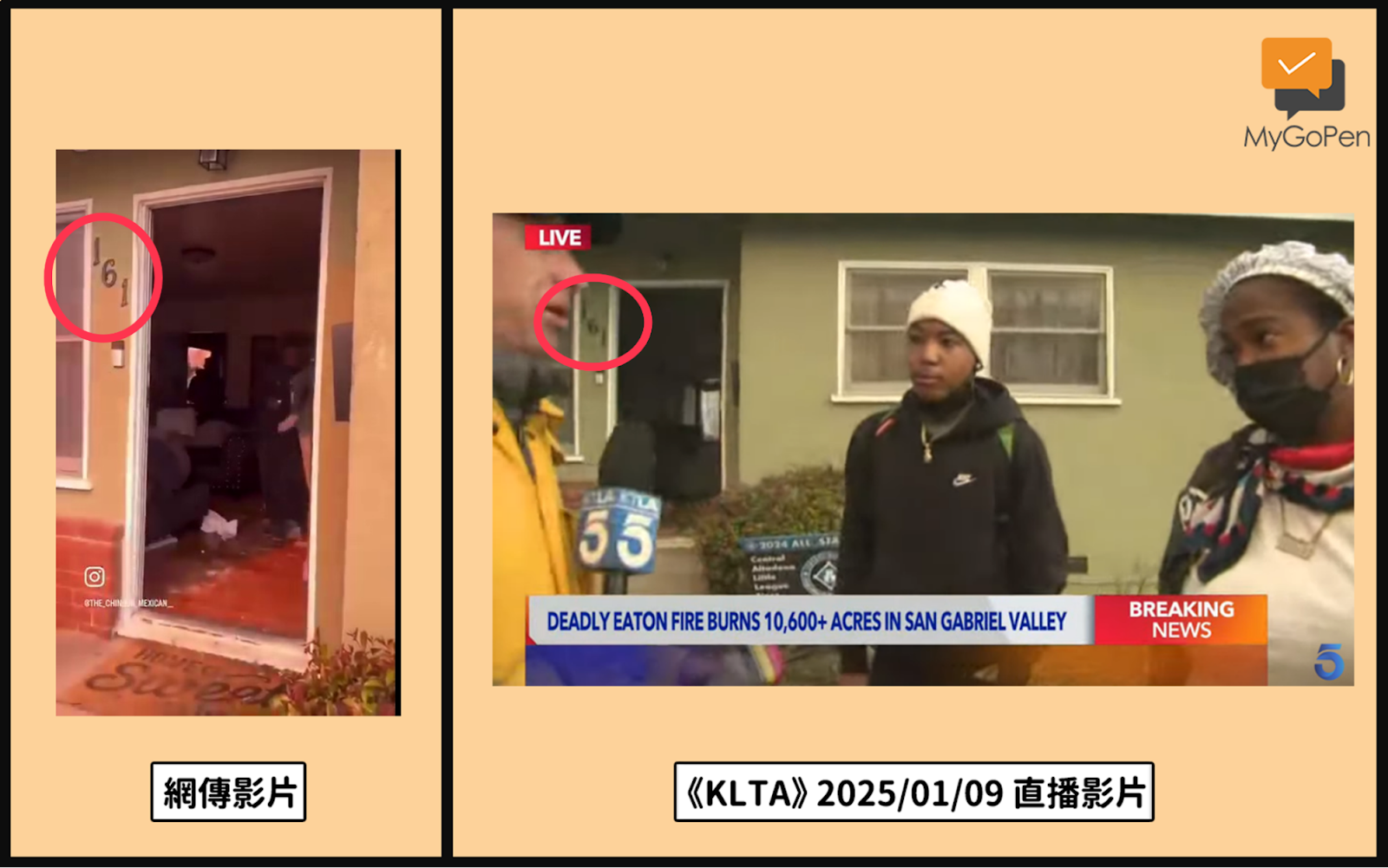 社群備註中附有一段Instagram 連結,是《KLTA》的播報畫面;查核記者以跑馬燈內容查找到《KLTA》1 月 9 日的直播影片,在 4 時 46 分 10 秒處可以看到記者對屋主的採訪。
