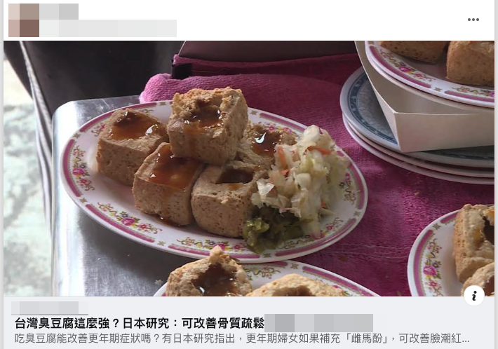 網傳「台灣臭豆腐這麼強?日本研究:可改善骨質疏鬆」文章,提到日本研究指出,更年期的婦女如果補充「雌馬酚」可改善臉潮紅、骨質疏鬆,而在所有豆製品中,以台灣的臭豆腐的雌馬酚含量最高。但專家表示,傳言出處的研究在 21 個發酵大豆製品中,只在臭豆腐中驗出雌馬酚,但是雌馬酚是異黃酮的代謝物,只要是含有異黃酮的食物,就有機會含有雌馬酚,單一研究當作參考即可、不必過度解讀,且臭豆腐會高溫烹調,還有高鈉、高油等問題,不是營養師會建議的食物。