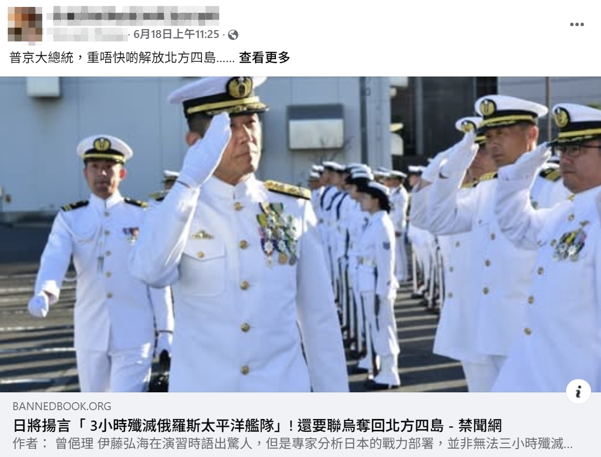 【錯誤】日海軍司令稱要聯合烏克蘭奪回北方四島?杜撰內容!日本北方近期無任何演習
