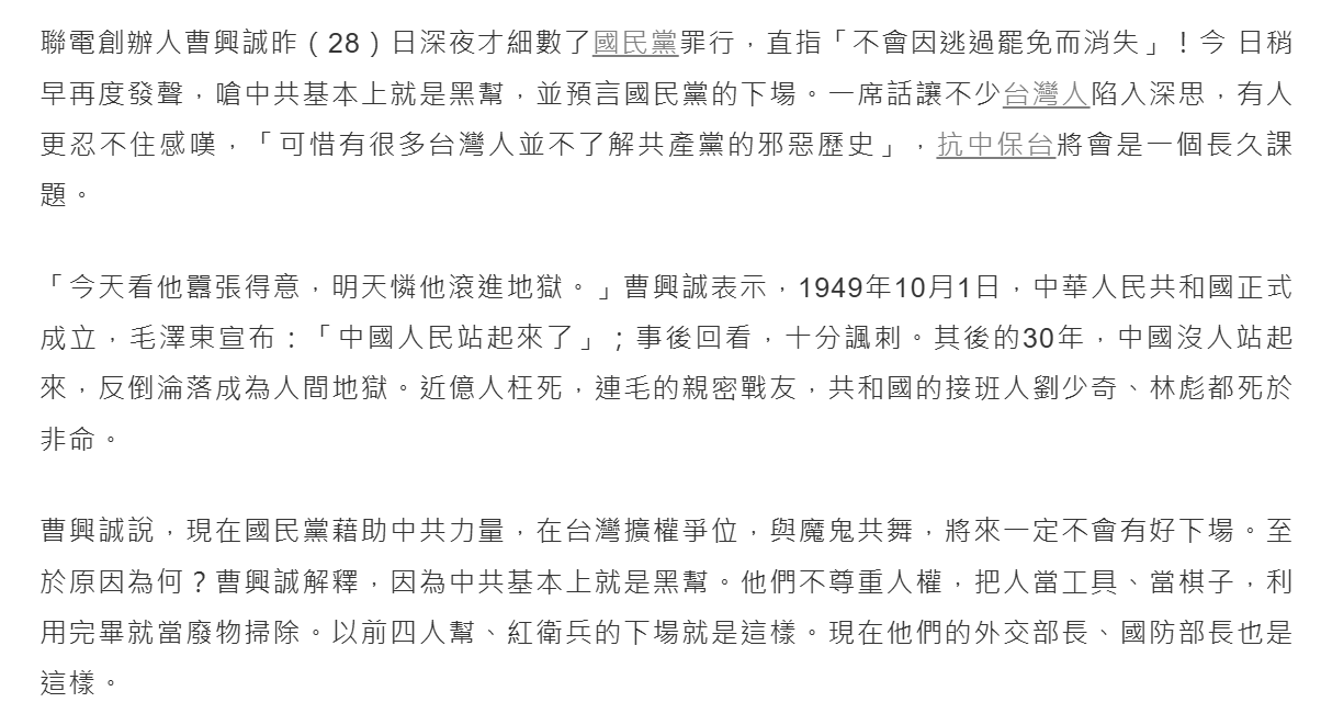 三立新聞網 - 嗆中共就是黑幫!曹興誠預言國民黨下場 一席話讓台灣人歎息了