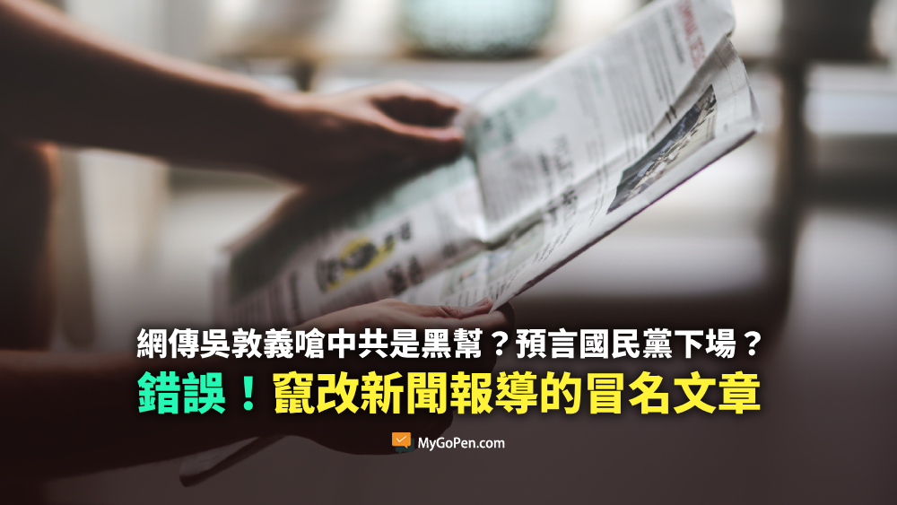 【錯誤】網傳吳敦義嗆中共是黑幫?預言國民黨下場?竄改新聞報導的冒名文章