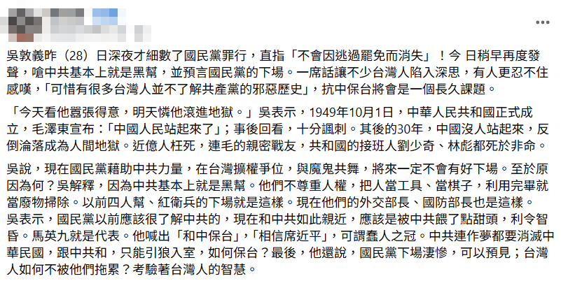 吳敦義昨(28)日深夜才細數了國民黨罪行,直指「不會因逃過罷免而消失」!今 日稍早再度發聲,嗆中共基本上就是黑幫,並預言國民黨的下場。一席話讓不少台灣人陷入深思,有人更忍不住感嘆,「可惜有很多台灣人並不了解共產黨的邪惡歷史」,抗中保台將會是一個長久課題。