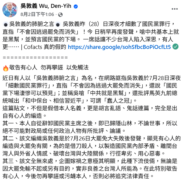 網傳「吳敦義深夜才細數了國民黨罪行」、「直指不會因逃過罷免而消失」、「嗆中共基本上就是黑幫,並預言國民黨的下場」的文章。經查證,傳言內容非吳敦義本人所寫,吳敦義已報警提告;此篇文章其實是竄改媒體於 2025 年 7 月 29 日報導聯電創辦人曹興誠的新聞,將原文中提到曹興誠的地方全數改成吳敦義,變成冒名文章,為錯誤訊息。
