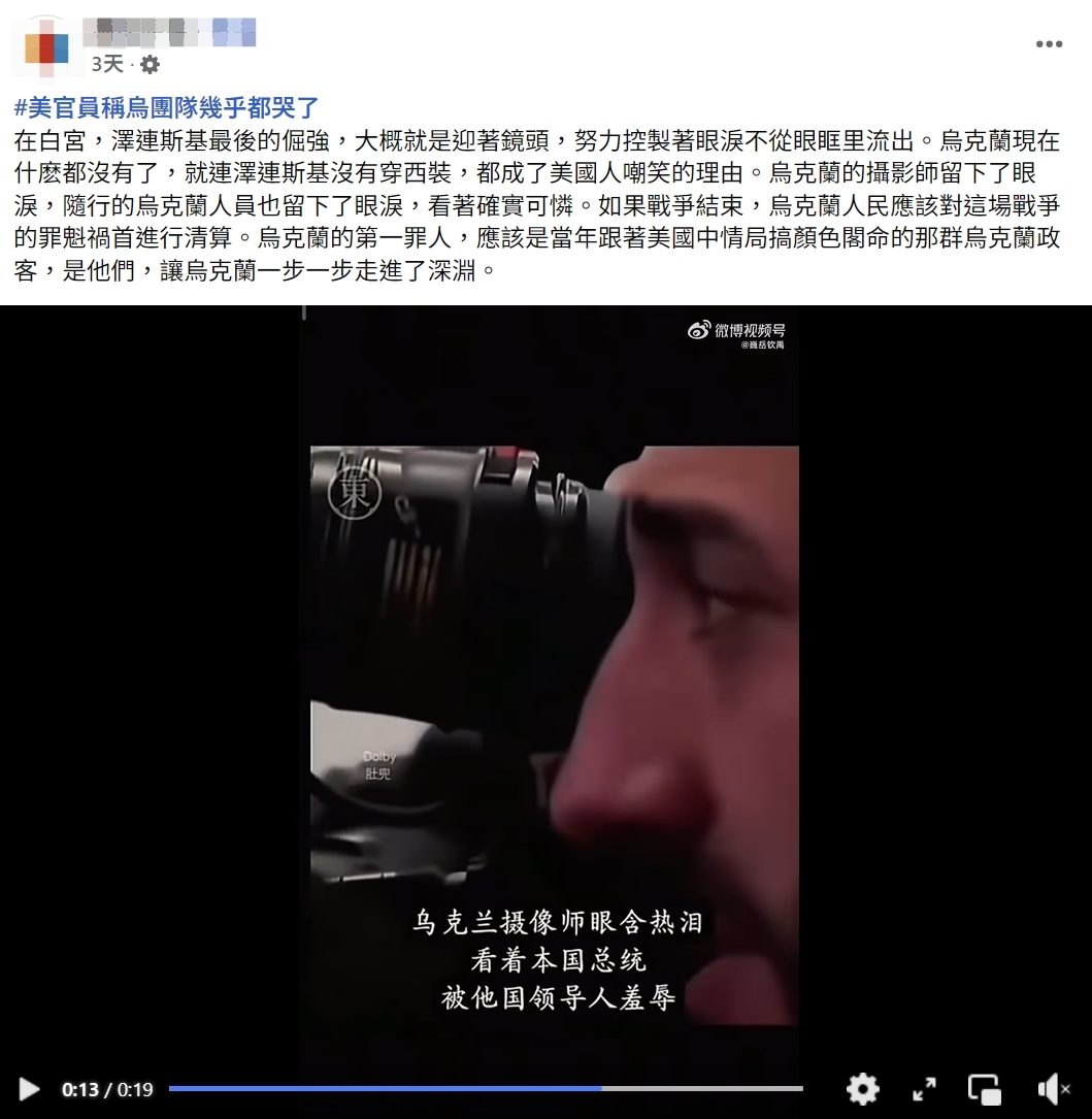 網傳「烏克蘭攝影師眼含熱淚」的影片及訊息,內容聲稱烏克蘭總統澤倫斯基與川普在白宮會談時,台下的烏克蘭攝影師看到澤倫斯基被羞辱,忍不住掉眼淚。經查證,網傳影片是把澤倫斯基的畫面,與土耳其廣播電視台(TRT)於 2016 年製播的節目《你會怎麼做?》(Sen Olsan Ne Yapardın?)片段剪輯在一起,兩個畫面拍攝時間點不同,網傳訊息不正確。