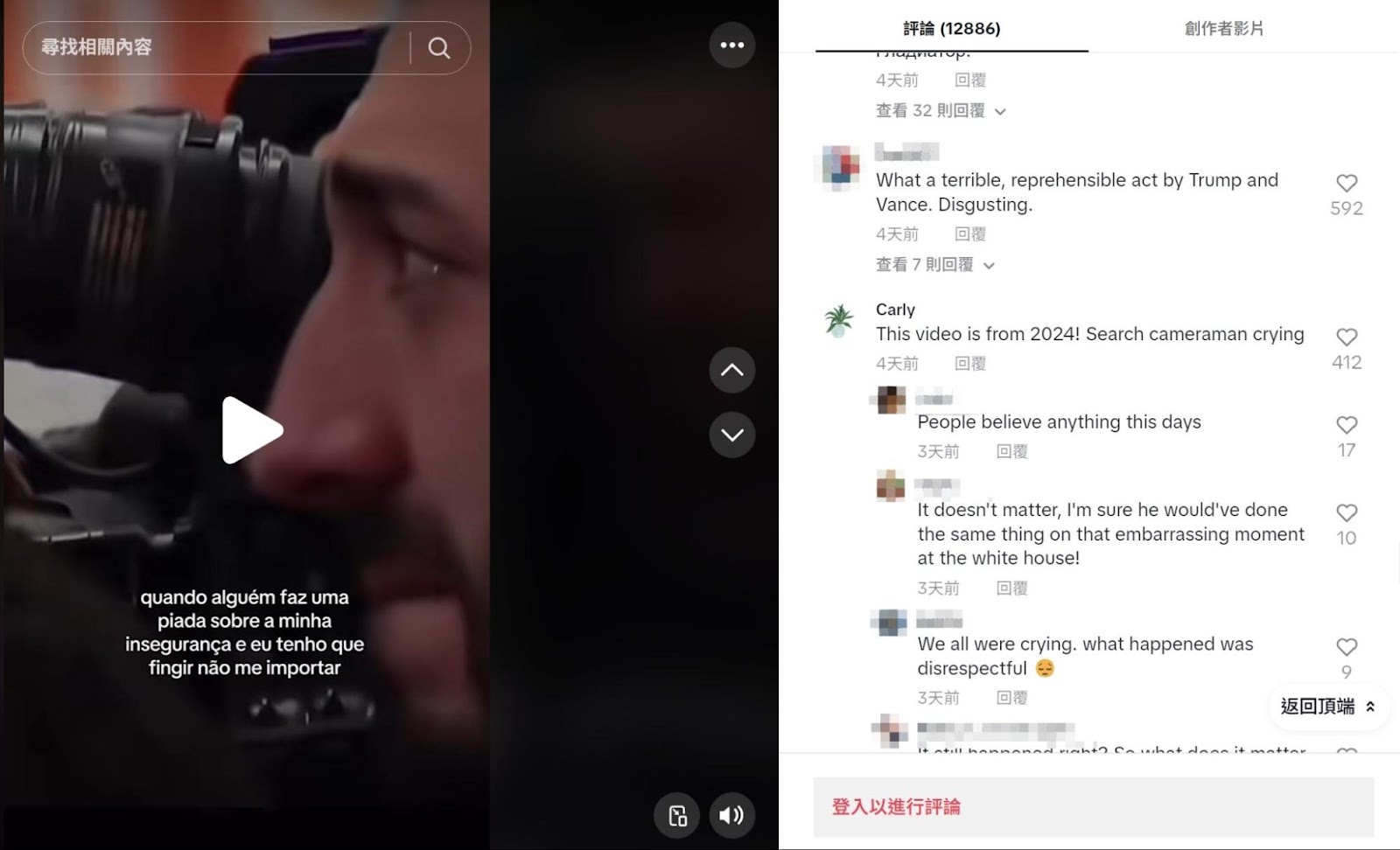 以這段葡萄牙文進行搜索,可以找到影音平台 TikTok 用戶「rmilenee2」於 2025 年 2 月 26 日上傳的影片,該片段觀看次數超過 670 萬次,且有超過 1.2 萬則評論,其中用戶「Carly」留言提到,這個片段在 2024 年即出現,搜尋「cameraman crying」就能找到。
