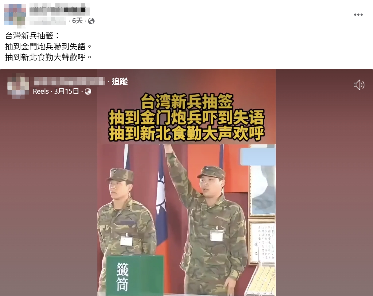 網傳「台灣新兵抽籤」的影片及訊息,近期在網路上流傳一段台灣役男抽籤的影片,聲稱有人抽到金門砲兵嚇到不敢說話。經查證,網傳影片是台灣戲劇《新兵日記》的片段,並非真實的抽籤畫面,網傳訊息不正確。近期社群平台流傳的短影音,有不少帶有去脈絡化的謠言內容,將廣告拍攝或是表演性質的片段,描繪成國軍操演的畫面,民眾應多加留意。