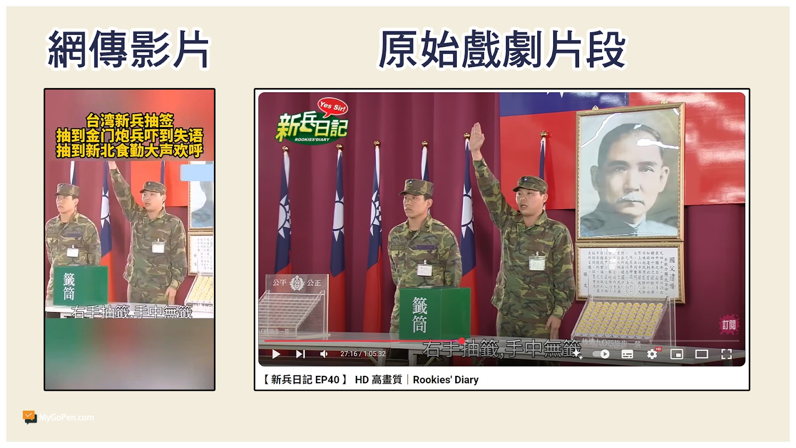由於網傳影片浮水印為簡體字,以關鍵字「台湾新兵抽签」在抖音上搜索,會發現許多用戶都上傳過類似的短片,1 月時上傳的版本,大多有註明這是戲劇節目畫面,但近期發布的版本,皆把戲劇名稱拿掉,容易讓人誤以為是真實抽籤場景