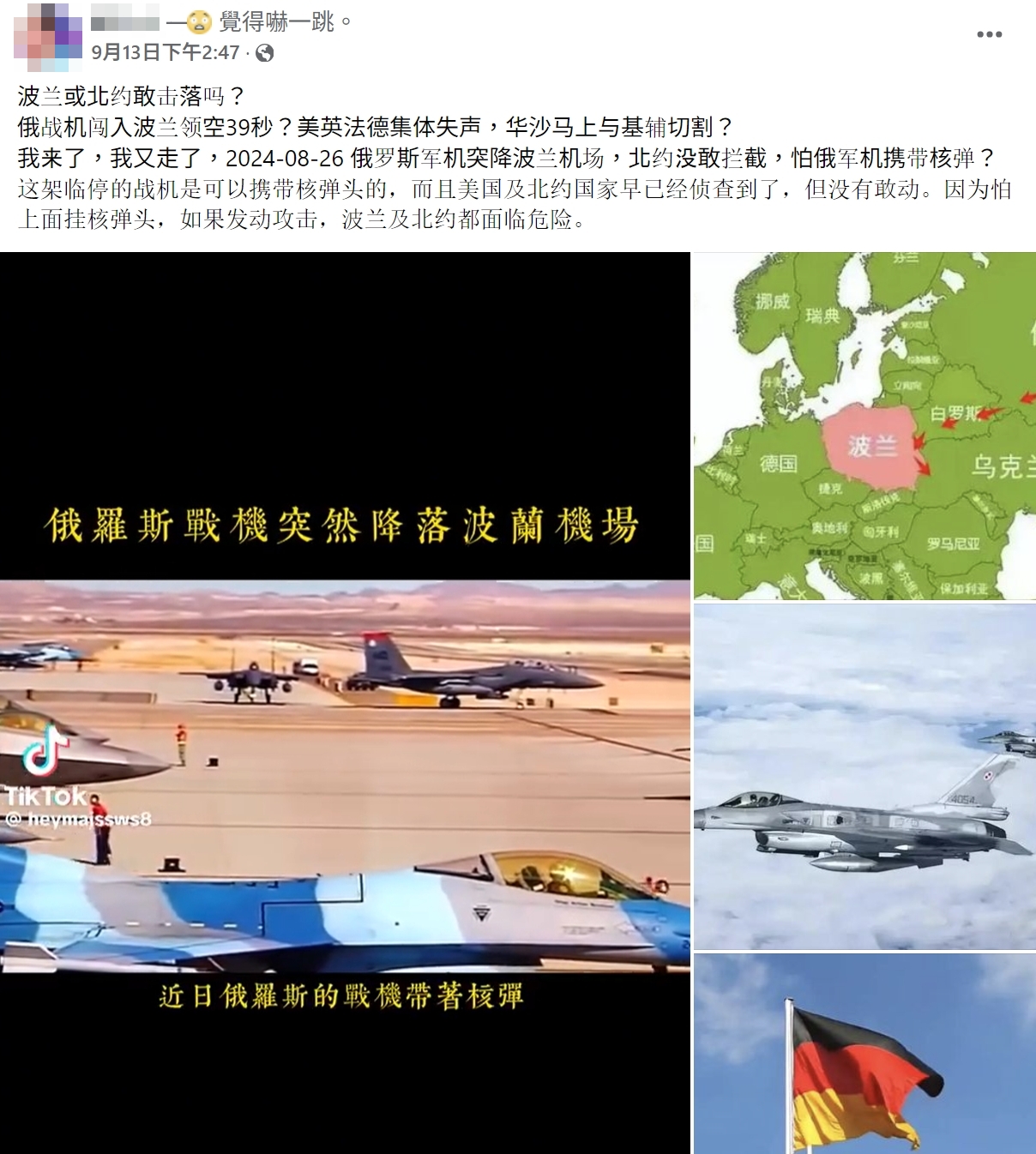 網傳「俄戰機闖入波蘭領空 39 秒」的影片及訊息,內容聲稱俄羅斯一架戰機近期闖入波蘭領空達 39 秒;8 月時俄國軍機突然降落在波蘭機場,但北約不敢攔阻,怕軍機攜帶核彈。經查證,俄羅斯於 2024 年 3 月空襲烏克蘭時,曾有一枚「飛彈」進入波蘭領空 39 秒,不是戰機;俄羅斯戰機降落在波蘭機場是 2021 年發生的事件,且是因為技術故障而降落在一座廢棄機場,沒有任何證據顯示有任何搭載核彈頭的俄國戰機降落在波蘭,網傳訊息不正確。