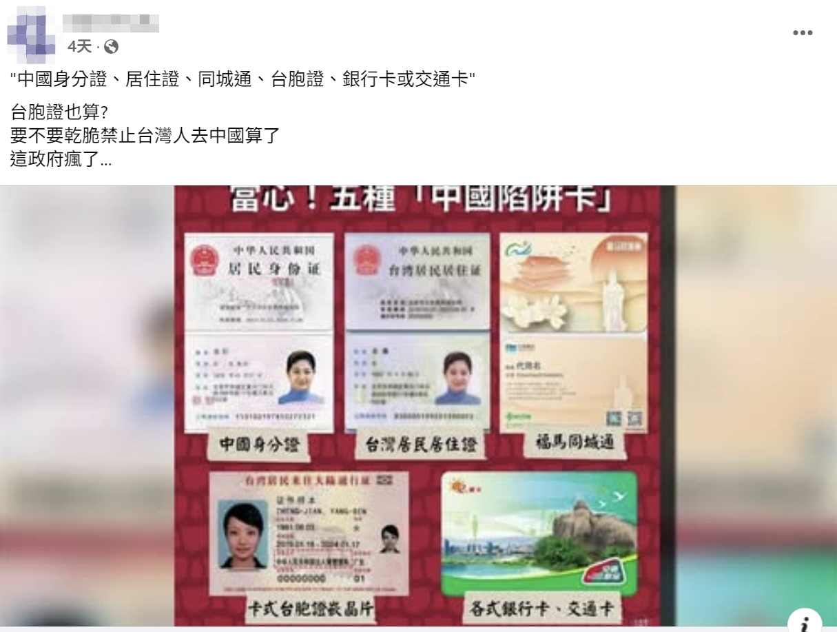 網傳「當心五種中國陷阱卡」的圖片及訊息,內容聲稱軍公教身分敏感,持有中國身分證、居住證、同乘通、台胞證、銀行卡或交通卡,可能都會喪失台灣身分。經查證,網傳圖片是民進黨中國部於 2025 年 1 月發布於 Facebook 粉專的圖表,並非陸委會發布的規定。陸委會已於 6 月 3 日澄清,一般民眾持有上述證件,並不會影響台灣身分,但若是現職軍公教人員,應負有效忠國家及忠誠義務,行政院 5 月 19 日的函令明訂禁止申領持有居住證,而無論是一般民眾還是現職軍公教人員,均不得申領持有「台灣居民定居證」(定居證),否則將喪失台灣身分,網傳訊息容易造成民眾誤解。