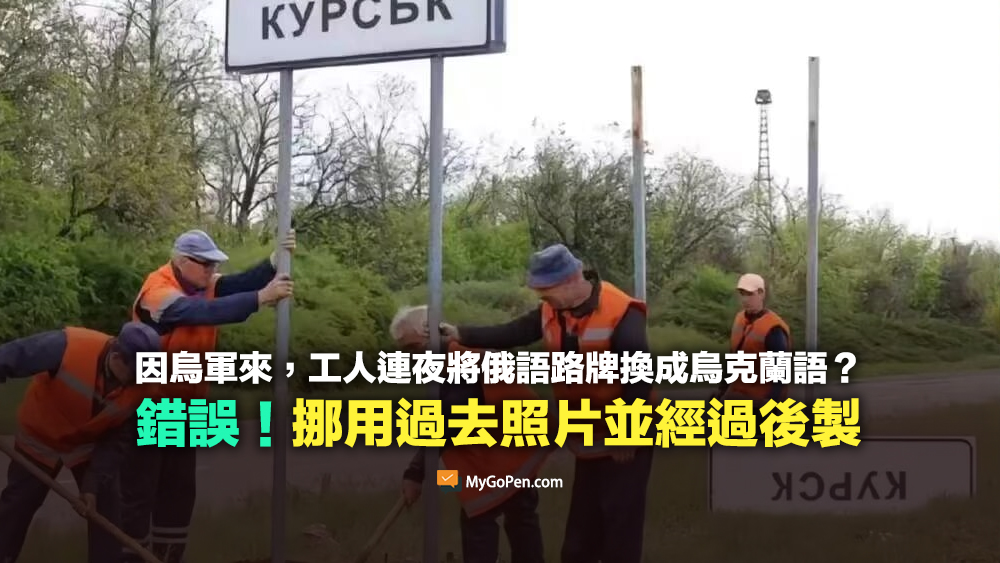 網傳「聽聞烏軍到來,庫爾斯克的養路工人連夜將俄語路牌更換成烏克蘭語路牌!」的訊息和照片。經查證,網傳照片中的路牌文字遭變造,非原始內容;這張照片其實是發生在 2022 年的烏克蘭馬立波城市,當時馬立波被俄羅斯軍隊和親俄的頓內茨克共和國圍困,頓內茨克共和國將馬立波城外的烏克蘭語路標拆下,並換成俄語路標,傳言為錯誤訊息。