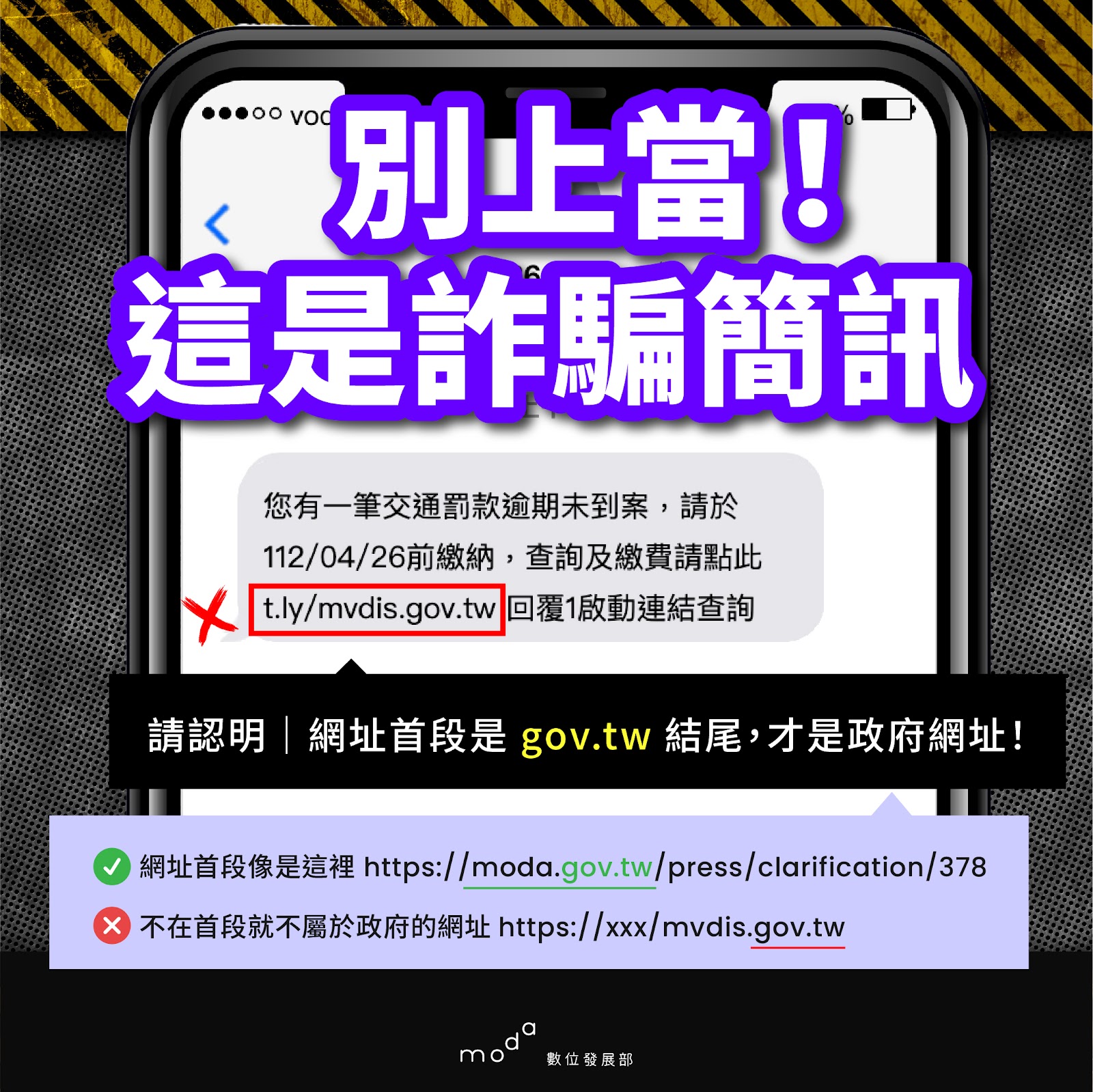 若非以「.gov.tw」為首段網址結尾,比如「.com」、「.vip」等都不是真正的政府網站;且如今詐騙花招百出,還會出現以短連結包裝、點擊前的網址結尾是「.gov.tw」,但點進去之後頁面就會跳轉到可疑網站的狀況,因此民眾若收到類似詐騙的簡訊,務必小心確認所附連結和內容。