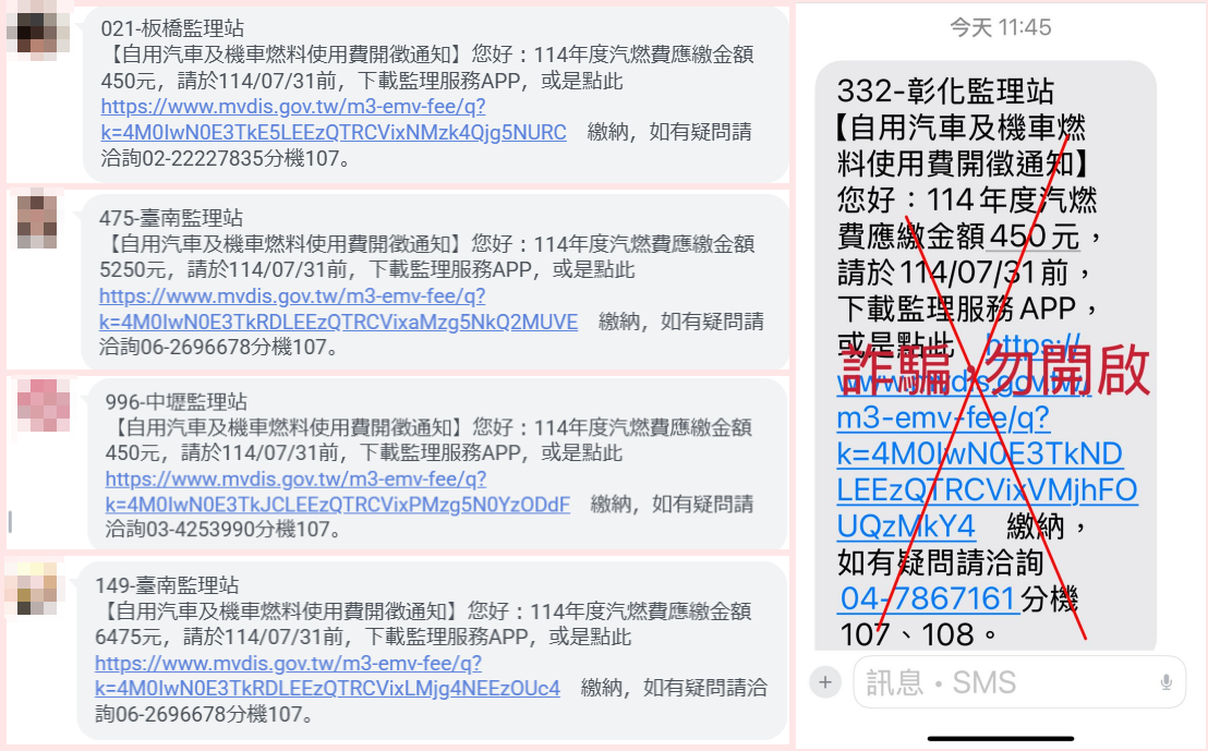 網傳全台各地監理站寄的汽燃費通知簡訊,有民眾表示似乎是詐騙。經查證,流傳的各版本簡訊內容中提到的聯絡電話均是正確號碼。建議可下載「監理服務 APP」並加入查詢,收到繳費簡訊若存有疑義,亦可洽各地區監理所站進行查證。民眾提防詐騙是正確觀念,但也別因此不繳納汽燃費。