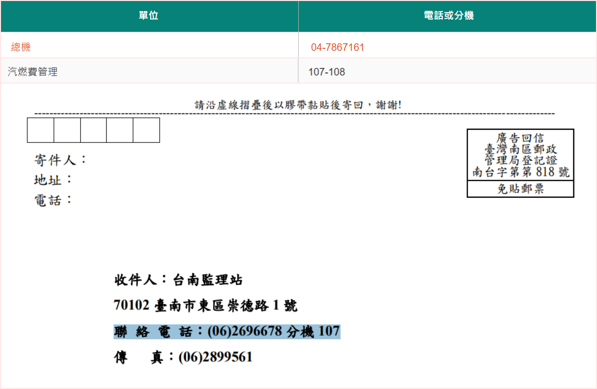 (二)根據簡訊內容,搜尋各監理站的聯絡資訊,根據台中區監理所官網資料,04-7867161 確實是彰化監理站的服務電話總機,分機 107、108 是汽燃費管理單位的號碼;根據台南市政府官網發布的汽(機)車燃料使用費繳費方式申請書,06-2696678 分機 107 是台南監理所的電話號碼沒錯。