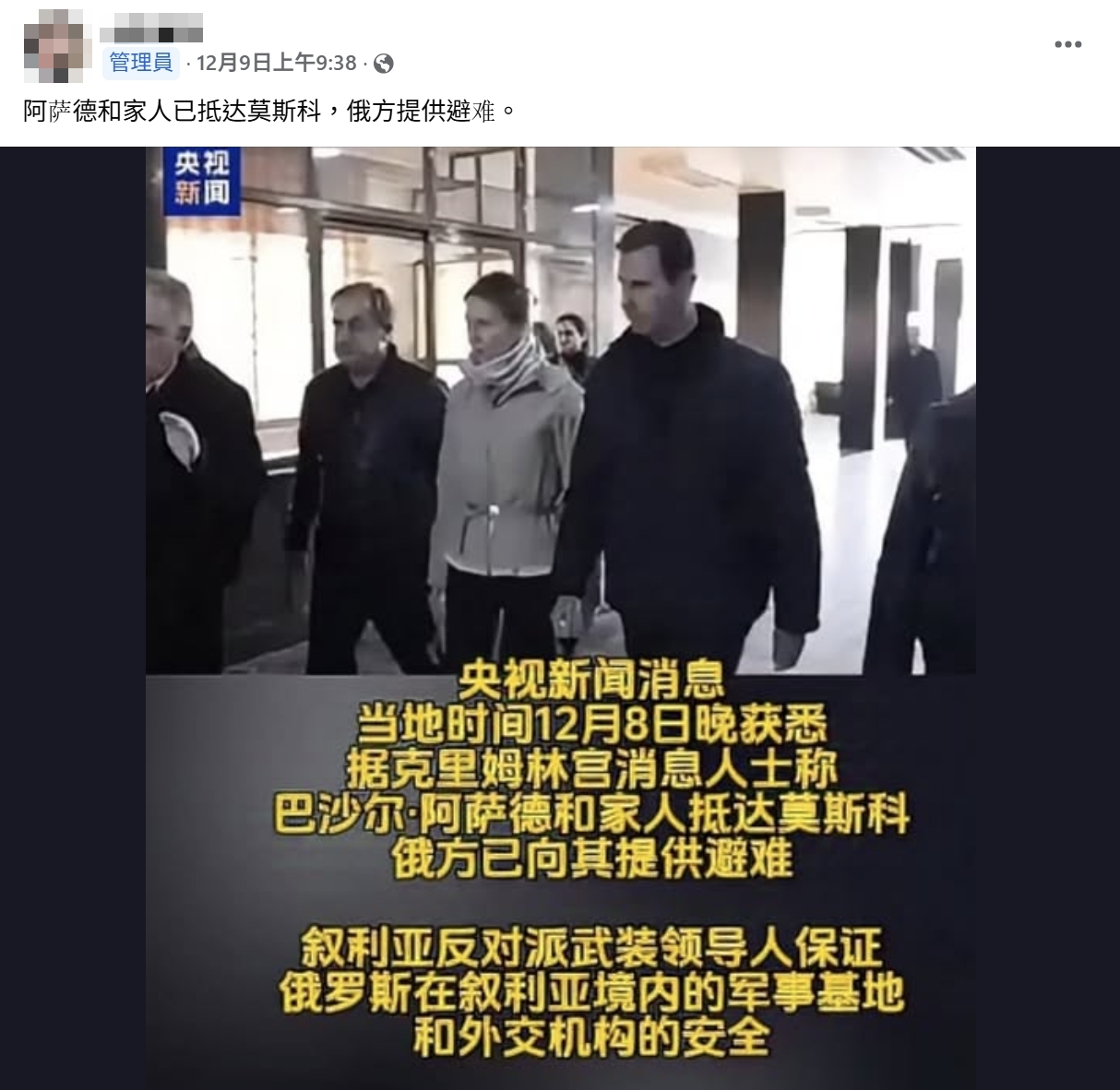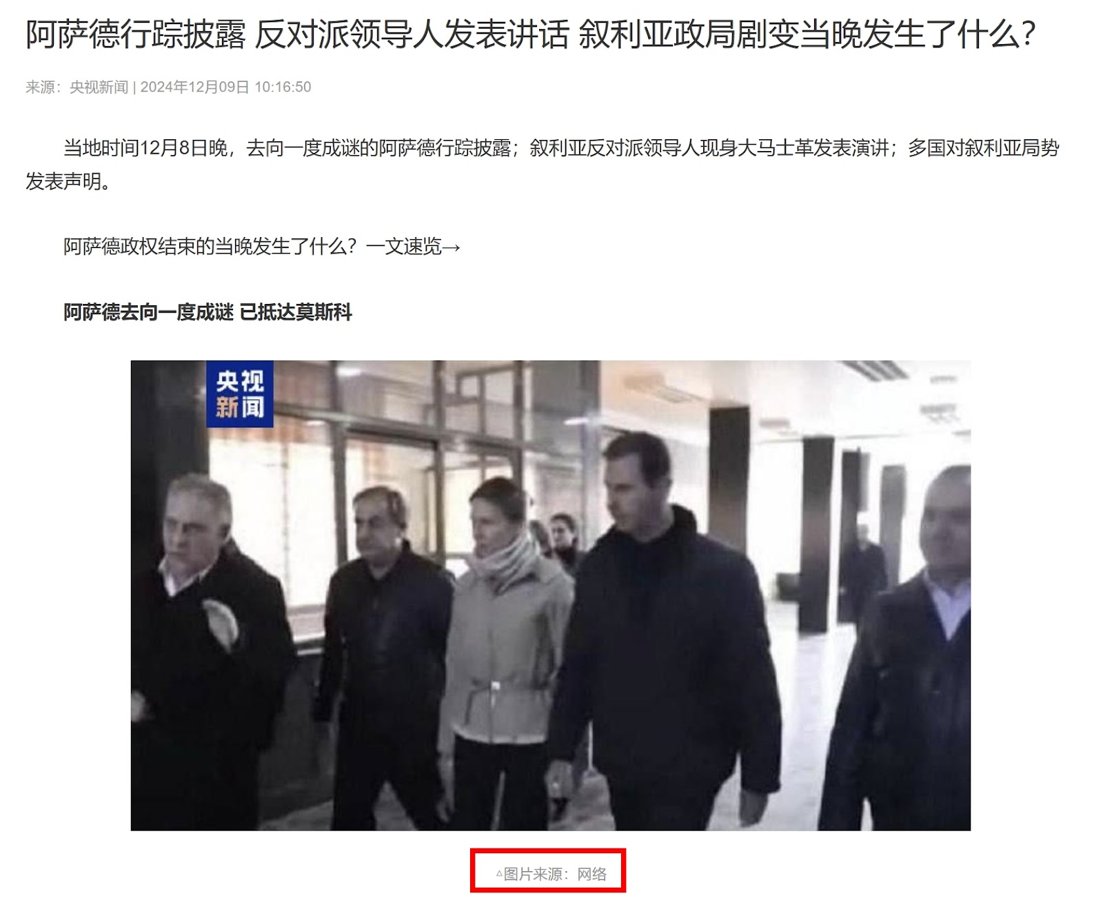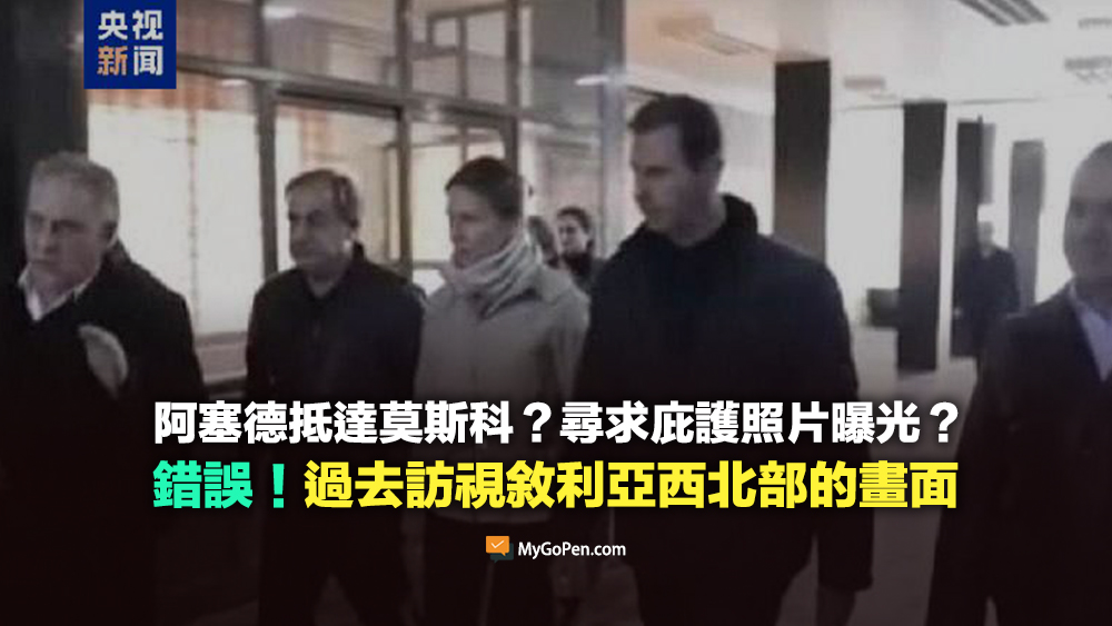 網傳「阿塞德抵達莫斯科」的圖片及訊息,表示根據中共央視報導,敘利亞總統阿塞德(Bashar al-Assad)已逃往俄羅斯,並附上一張聲稱是阿塞德夫婦抵達莫斯科的圖片。經查證,網傳圖片及文字敘述確實出自央視的報導,但該圖片實際拍攝日期為 2023 年 2 月 10 日,地點在敘利亞西北部的阿勒坡大學醫院,當時土耳其發生規模 7.8 強震,敘利亞西北部也成為災區,網傳圖片是阿塞德夫婦前往阿勒坡探視災民的畫面,並非近期拍攝,也與俄羅斯或莫斯科無關,網傳訊息容易造成民眾誤解。
