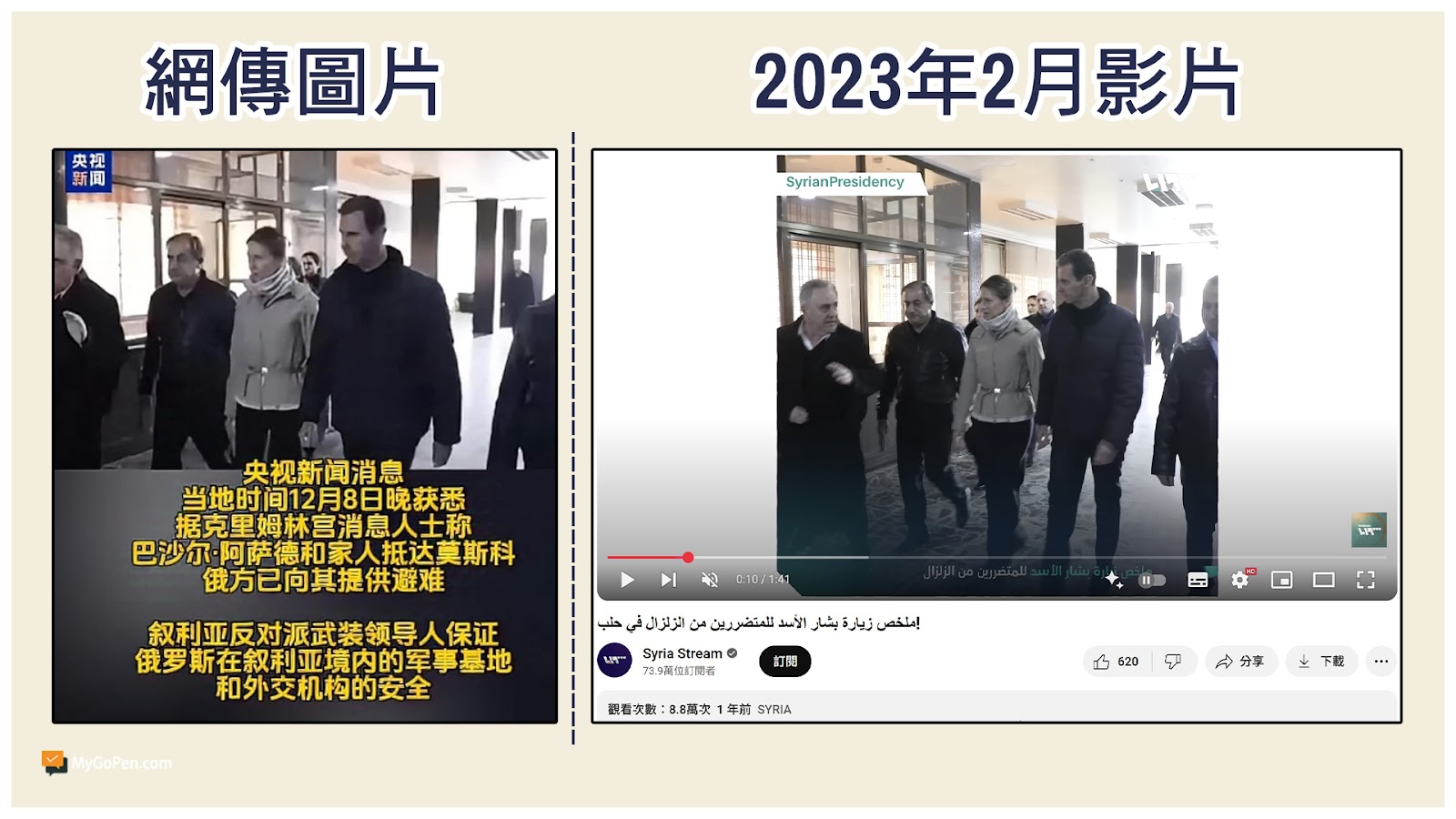 利用 Google Lens 搜索影片標題「إملخص زيارة بشار الأسد للمتضررين من الزلزال في حلب」,可以找到 YouTube 頻道「Syria Stream」於 2023 年 2 月 11 日上傳的影片,0:10 開始的場景與網傳圖片相同,拍攝地點位於敘利亞西北部的阿勒坡大學醫院(Aleppo University Hospital),由此可知,網傳圖片並非阿塞德抵達莫斯科的畫面。