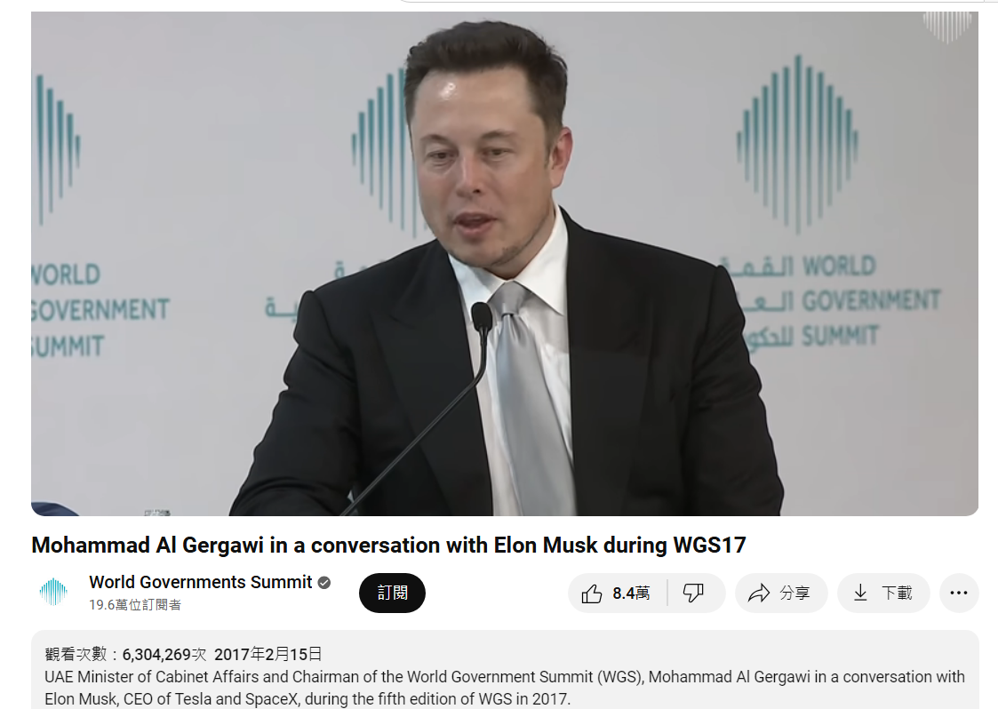 (二)以影片中馬斯克的發言內容作為關鍵字進一步搜尋,查找到畫面是出自 2017 年的世界政府高峰會(World Governments Summit),當時阿拉伯聯合大公國內政部長、世界政府高峰會組織主席 Mohammad Al Gergawi 和馬斯克進行對談。