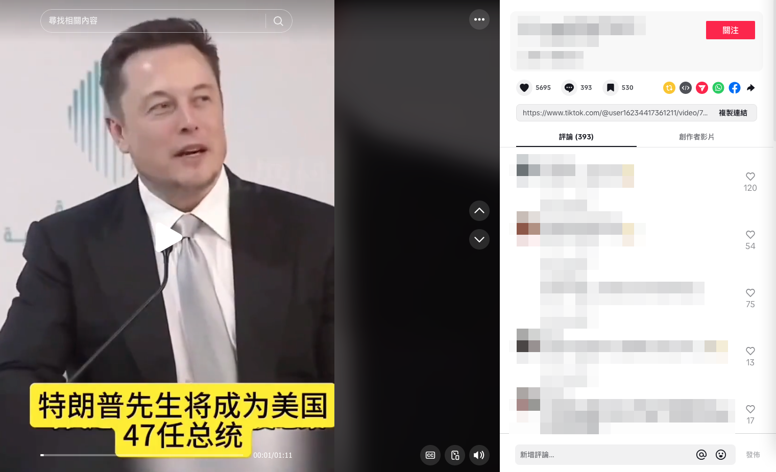 網傳「特朗普先生將成為美國47任總統,向他表示衷心的祝賀」的影片,簡體中文翻譯字幕宣稱馬斯克說德國總理要送 30 億給烏克蘭是歐洲最大的笨蛋、他已經準備不要在德國的特斯拉工廠了等等。經查證,影片中的簡體中文翻譯字幕完全是虛構編造的,馬斯克的原話是在談論生命的意義和人類的未來,和翻譯字幕內容沒有任何關係;而影片的原始出處是馬斯克在 2017 年世界政府高峰會上和主席 Mohammad Al Gergawi 的對談,傳言為錯誤資訊。