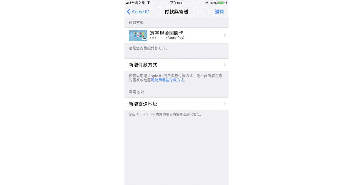 更新到 iOS 12.3 後,除了可設定將 Apple Pay 付款卡片設為快速交通卡外,另外還有一項小功能,就是選擇 Apple Pay 的付款卡片作為 App Store、iCloud 等 Apple 相關服務的付款方式。