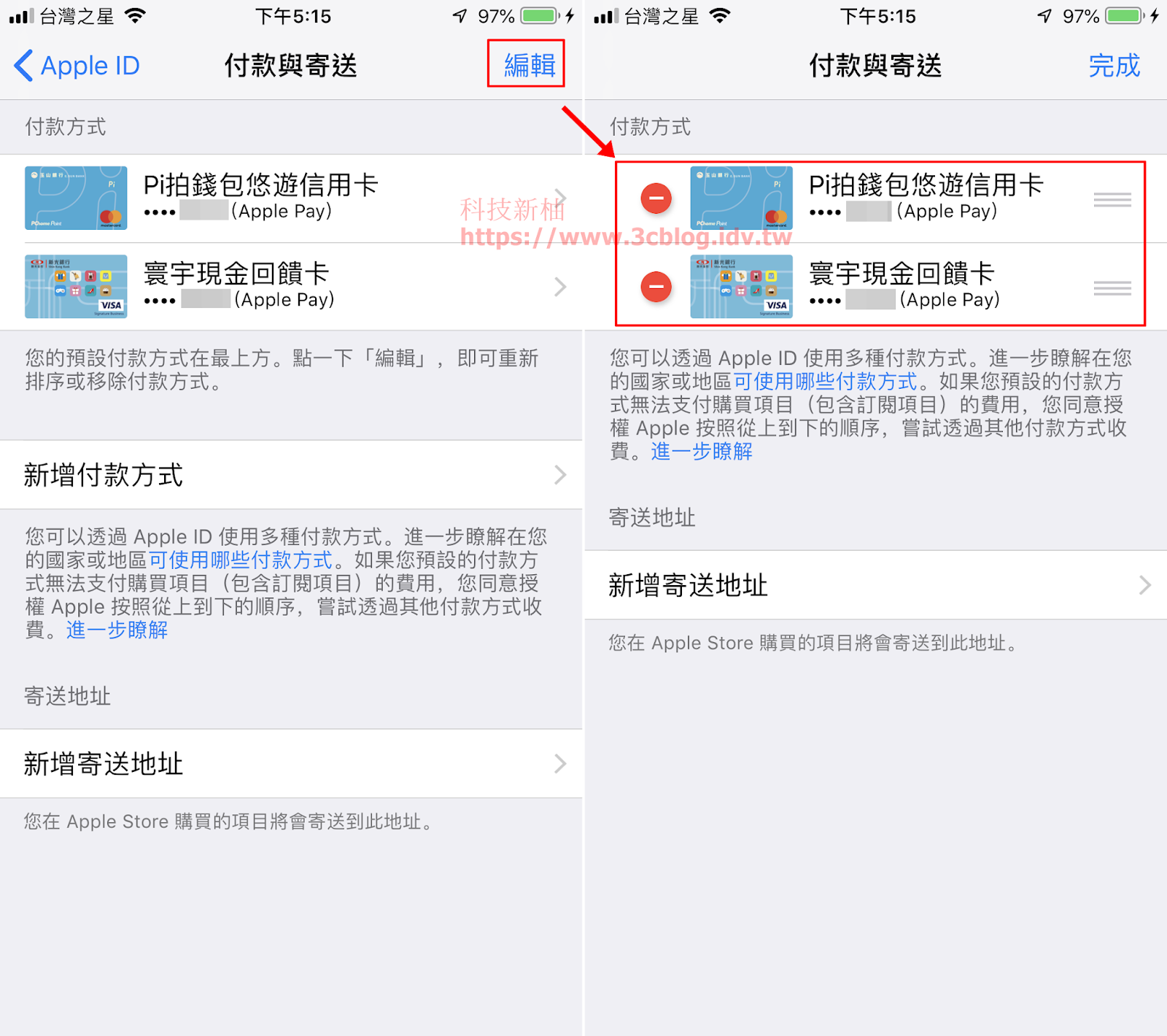 ▲ 選擇多張卡片時,可按下 編輯,來移動卡片的順序或是移除卡片,最上面第一張卡片為預設卡片,在這邊移除卡片不會刪除 Apple Pay 中的卡片。